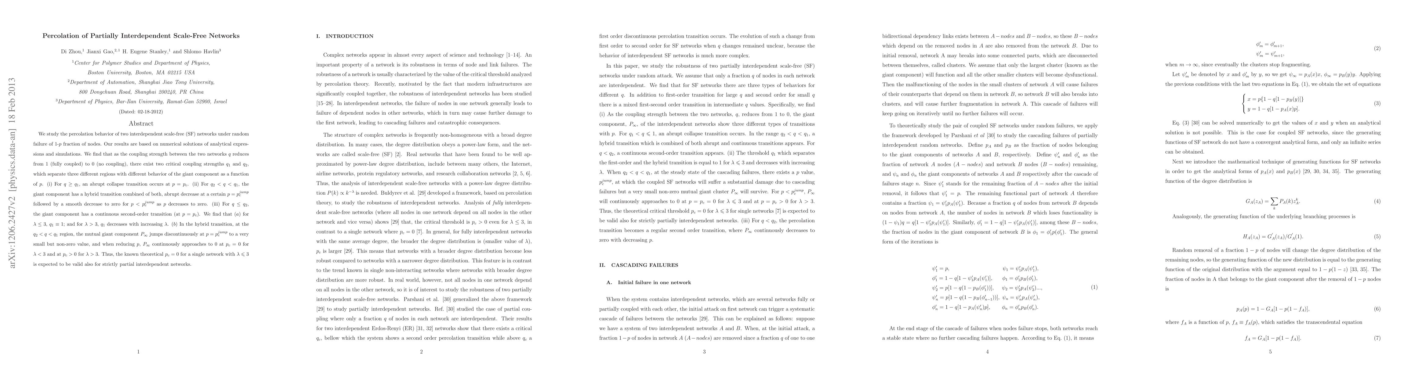Researchers studied the behavior of two interdependent scale-free networks under random failure, finding critical coupling strengths that separate different transition regions for giant component collapse.