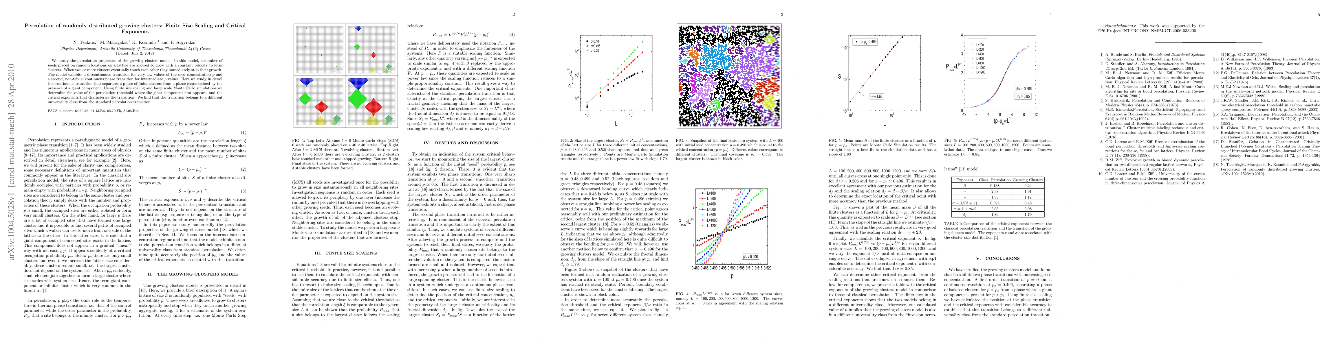 This paper investigates the percolation properties of a growing clusters model on a lattice, identifying a continuous phase transition characterized by the emergence of a giant component. Through finite size scaling and Monte Carlo simulations, the authors determine the percolation threshold and critical exponents, revealing a transition that belongs to a distinct universality class compared to standard percolation.