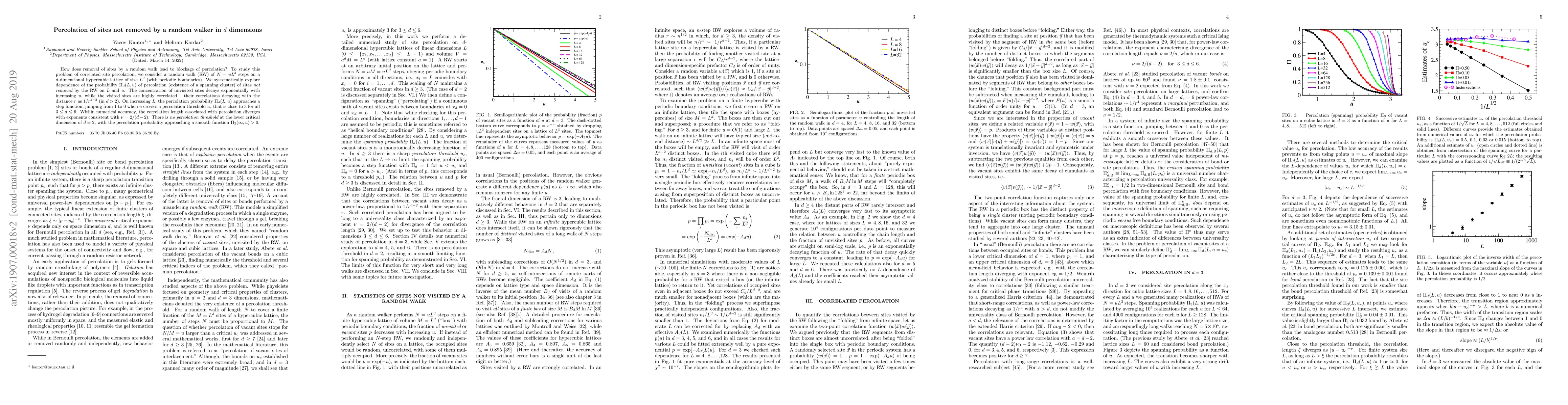 How does removal of sites by a random walk lead to blockage of percolation? To study this problem of correlated site percolation, we consider a random walk (RW) of $N=uL^d$ steps on a $d$-dimensional hypercubic lattice of size $L^d$ (with periodic boundaries). We systematically explore dependence of the probability $\Pi_d(L,u)$ of percolation (existence of a spanning cluster) of sites not removed by the RW on $L$ and $u$. The concentration of unvisited sites decays exponentially with increasing $u$, while the visited sites are highly correlated -- their correlations decaying with the distance $r$ as $1/r^{d-2}$ (in $d>2$). Upon increasing $L$, the percolation probability $\Pi_d(L,u)$ approaches a step function, jumping from 1 to 0 when $u$ crosses a percolation threshold $u_c$ that is close to 3 for all $3\le d\le6$. Within numerical accuracy, the correlation length associated with percolation diverges with exponents consistent with $\nu=2/(d-2)$. There is no percolation threshold at the lower critical dimension of $d=2$, with the percolation probability approaching a smooth function $\Pi_2(\infty,u)>0$.