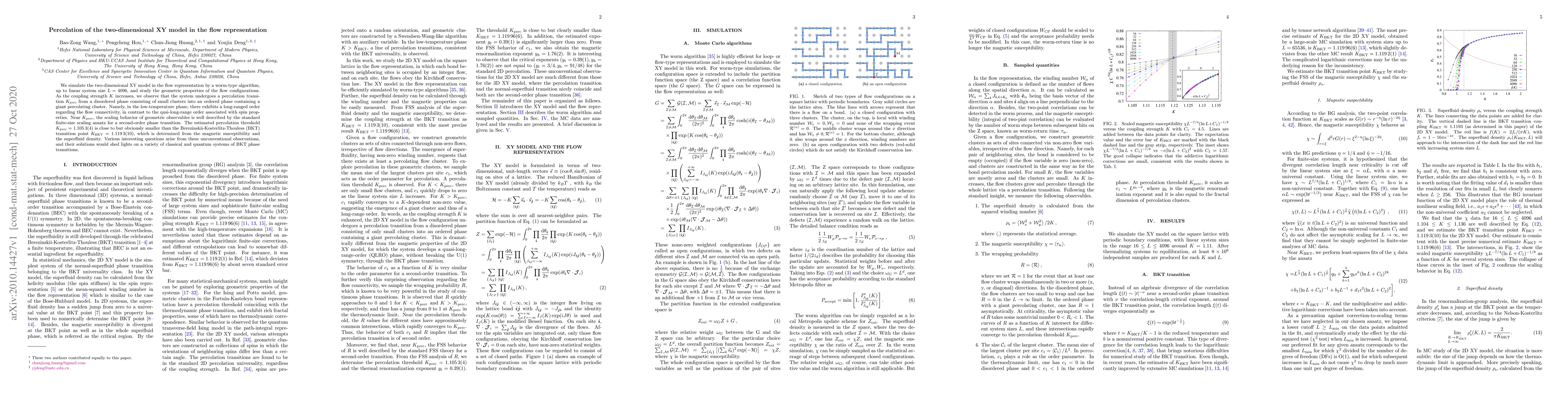We simulate the two-dimensional XY model in the flow representation by a worm-type algorithm, up to linear system size $L=4096$, and study the geometric properties of the flow configurations. As the coupling strength $K$ increases, we observe that the system undergoes a percolation transition $K_{\rm perc}$ from a disordered phase consisting of small clusters into an ordered phase containing a giant percolating cluster. Namely, in the low-temperature phase, there exhibits a long-ranged order regarding the flow connectivity, in contrast to the qusi-long-range order associated with spin properties. Near $K_{\rm perc}$, the scaling behavior of geometric observables is well described by the standard finite-size scaling ansatz for a second-order phase transition. The estimated percolation threshold $K_{\rm perc}=1.105 \, 3(4)$ is close to but obviously smaller than the Berezinskii-Kosterlitz-Thouless (BKT) transition point $K_{\rm BKT} = 1.119 \, 3(10)$, which is determined from the magnetic susceptibility and the superfluid density. Various interesting questions arise from these unconventional observations, and their solutions would shed lights on a variety of classical and quantum systems of BKT phase transitions.