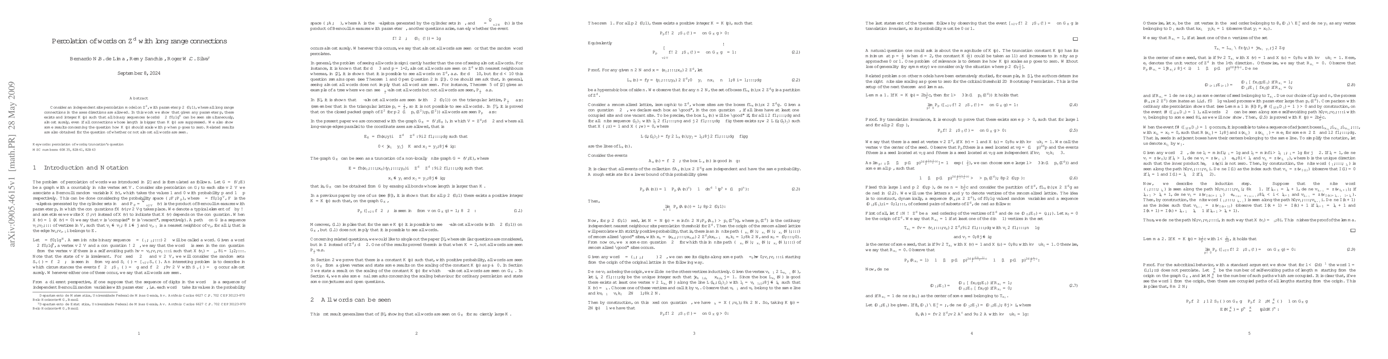 Consider an independent site percolation model on $\Z^d$, with parameter $p \in (0,1)$, where all long range connections in the axes directions are allowed. In this work we show that given any parameter $p$, there exists and integer $K(p)$ such that all binary sequences (words) $\xi \in \{0,1\}^{\N}$ can be seen simultaneously, almost surely, even if all connections whose length is bigger than $K(p)$ are suppressed. We also show some results concerning the question how $K(p)$ should scale with $p$ when $p$ goes to zero. Related results are also obtained for the question of whether or not almost all words are seen.