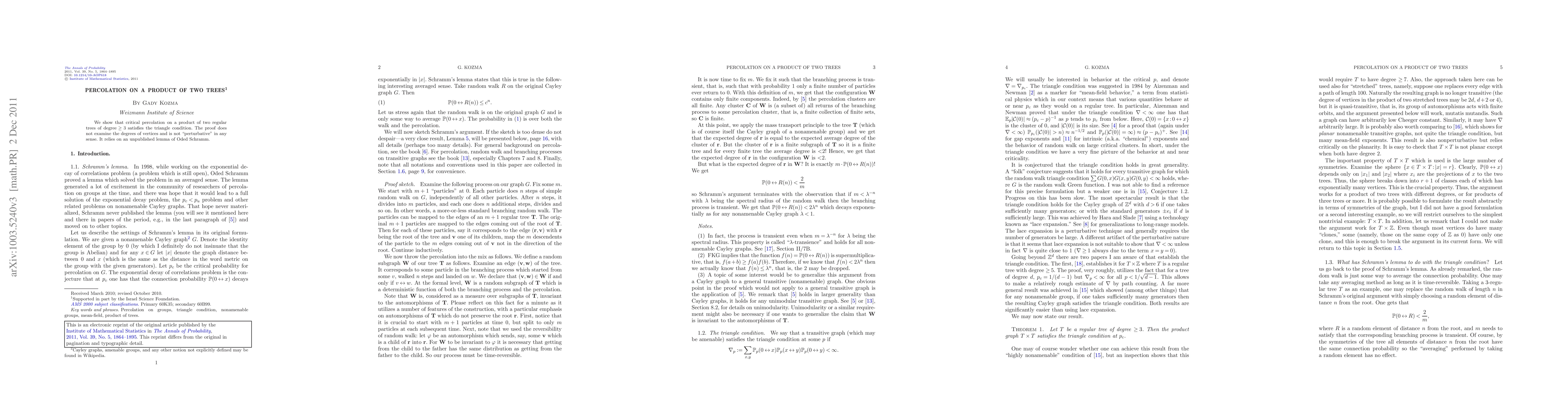This paper demonstrates that critical percolation on a product of two regular trees of degree ≥ 3 fulfills the triangle condition, utilizing an unpublished lemma by Oded Schramm without relying on vertex degrees or perturbation methods.