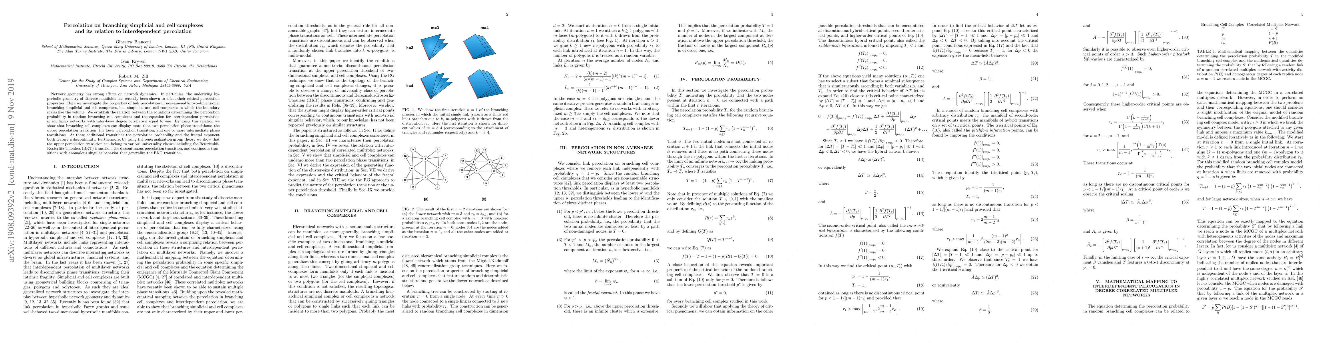 This paper explores percolation on branching simplicial and cell complexes, revealing multiple percolation phase transitions and establishing a connection to interdependent percolation in multiplex networks. The study uses renormalization group theory to identify various universality classes for the upper percolation transition.