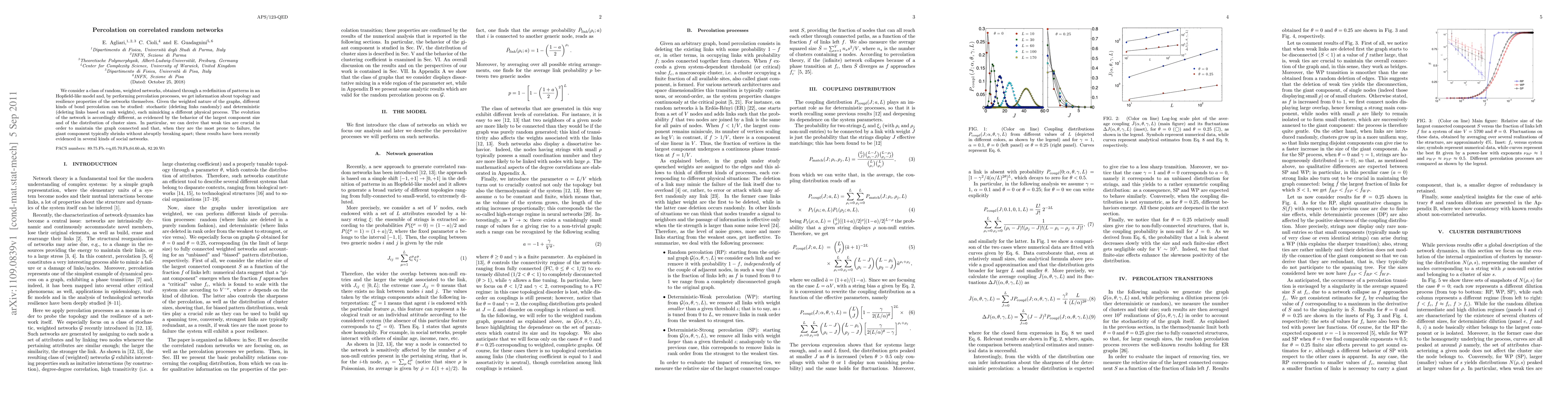 This research paper explores percolation on correlated random networks, studying the effects of bond deletion processes on network topology and resilience. It finds that weak ties play a crucial role in maintaining connectivity and that their failure leads to shrinking of the giant component without abrupt breakage.