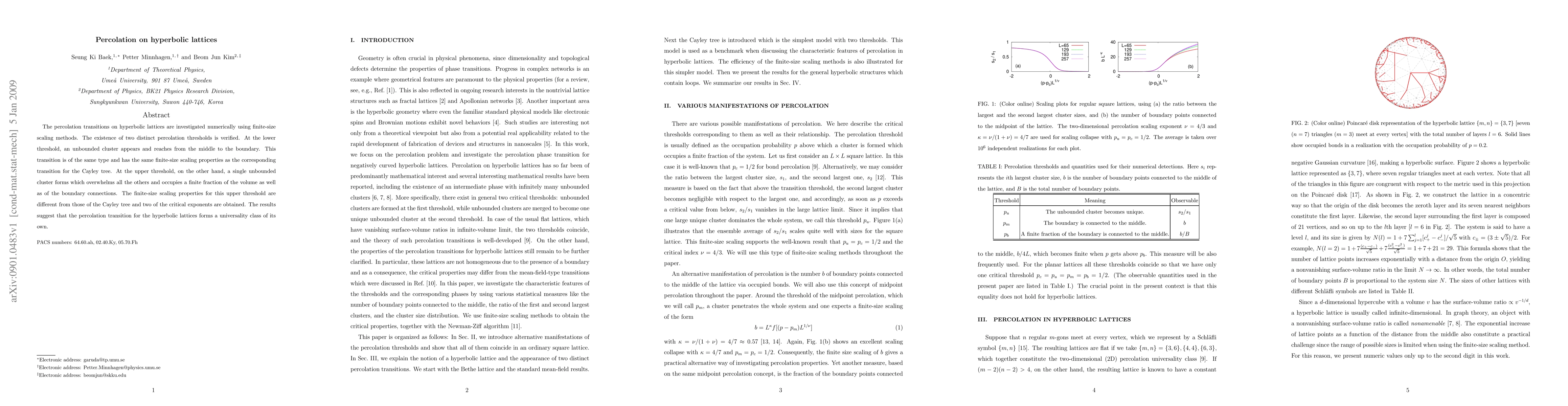 This paper investigates percolation transitions on hyperbolic lattices, finding two distinct percolation thresholds. The lower threshold exhibits behavior similar to the Cayley tree, while the upper threshold shows unique finite-size scaling properties, suggesting a new universality class for hyperbolic lattice percolation.