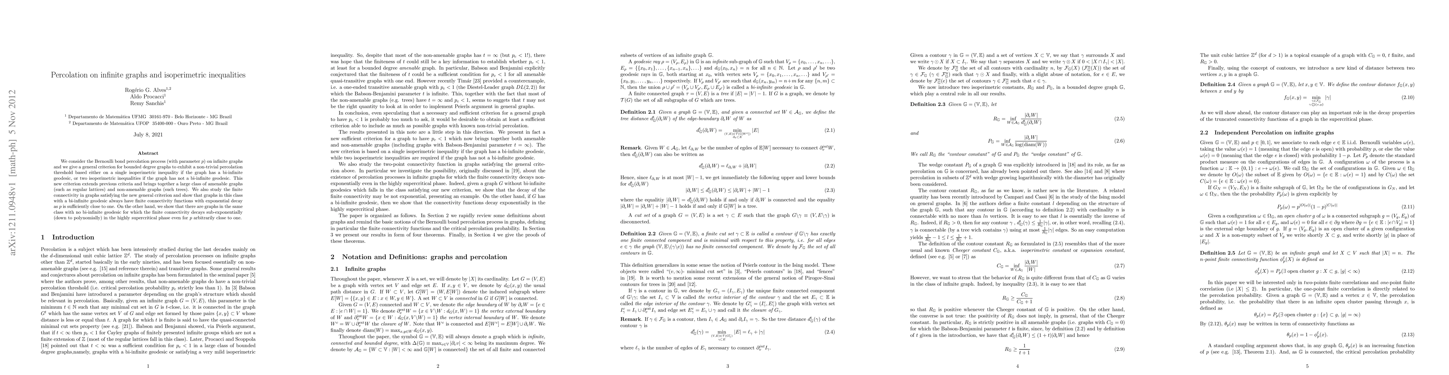 This paper establishes a new criterion for determining the percolation threshold on infinite graphs based on isoperimetric inequalities, extending previous criteria to a broader class of graphs. It shows that graphs with a bi-infinite geodesic exhibit finite connectivity with exponential decay, while those without such geodesics exhibit sub-exponential decay in connectivity.