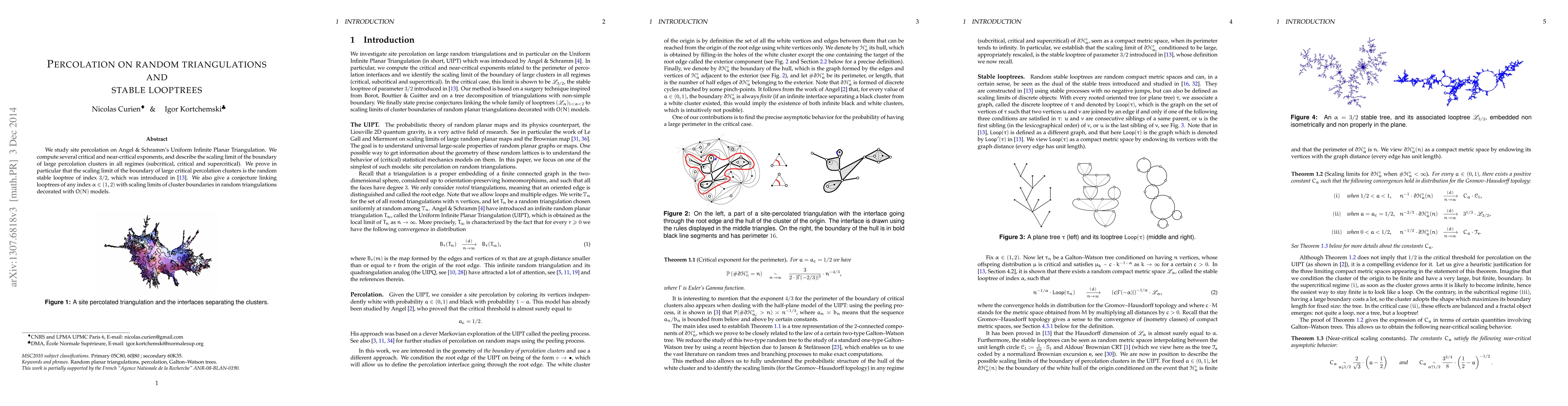 This paper investigates site percolation on a uniform infinite planar triangulation, determining critical and near-critical exponents and describing the scaling limit of cluster boundaries. It proves that the boundary of large critical percolation clusters converges to a random stable looptree of index 3/2. Additionally, it proposes a conjecture connecting looptrees of indices in (1,2) with cluster boundaries in decorated random triangulations.
