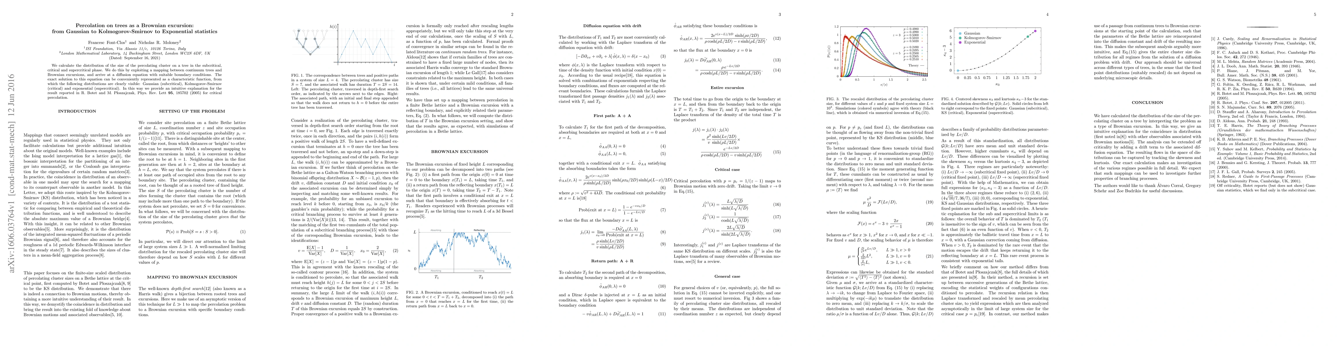 We calculate the distribution of the size of the percolating cluster on a tree in the subcritical, critical and supercritical phase. We do this by exploiting a mapping between continuum trees and Brownian excursions, and arrive at a diffusion equation with suitable boundary conditions. The exact solution to this equation can be conveniently represented as a characteristic function, from which the following distributions are clearly visible: Gaussian (subcritical), Kolmogorov-Smirnov (critical) and exponential (supercritical). In this way we provide an intuitive explanation for the result reported in R. Botet and M. Ploszajczak, Phys. Rev. Lett 95, 185702 (2005) for critical percolation.