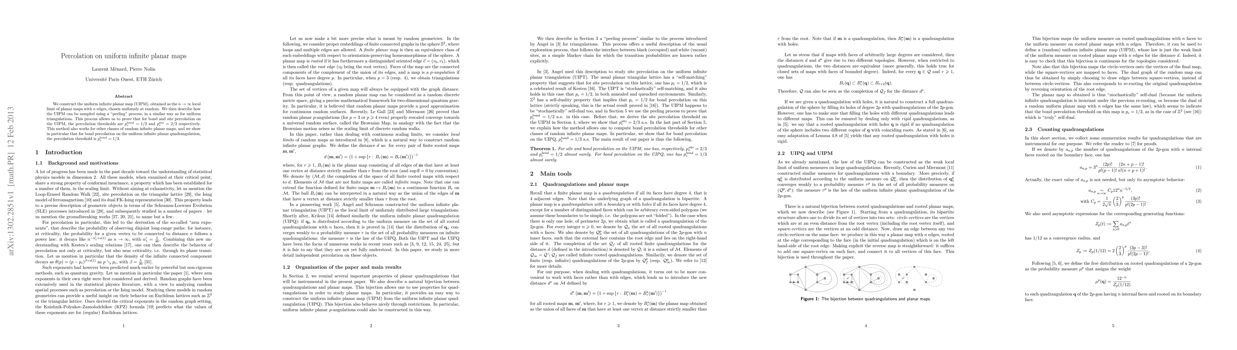 The research constructs the uniform infinite planar map (UIPM) as the local limit of planar maps with n edges, chosen uniformly at random. It employs a 'peeling' process to sample the UIPM, similar to that for uniform triangulations, and proves percolation thresholds for bond and site percolation on the UIPM.