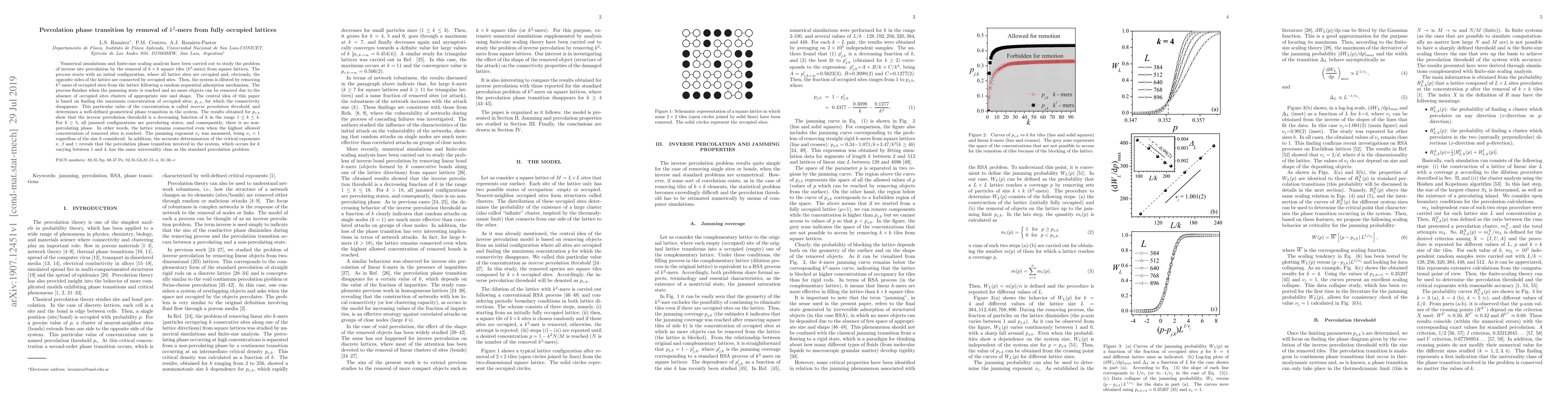 Numerical simulations and finite-size scaling analysis have been carried out to study the problem of inverse site percolation by the removal of $k \times k$ square tiles ($k^{2}$-mers) from square lattices. The process starts with an initial configuration, where all lattice sites are occupied and, obviously, the opposite sides of the lattice are connected by occupied sites. Then, the system is diluted by removing $k^{2}$-mers of occupied sites from the lattice following a random sequential adsorption mechanism. The process finishes when the jamming state is reached and no more objects can be removed due to the absence of occupied sites clusters of appropriate size and shape. The central idea of this paper is based on finding the maximum concentration of occupied sites, $p_{c,k}$, for which the connectivity disappears. This particular value of the concentration is called \textit{inverse percolation threshold}, and determines a well-defined geometrical phase transition in the system. The results obtained for $p_{c,k}$ show that the inverse percolation threshold is a decreasing function of $k$ in the range $1 \leq k \leq 4$. For $k \geq 5$, all jammed configurations are percolating states, and consequently, there is no non-percolating phase. In other words, the lattice remains connected even when the highest allowed concentration of removed sites is reached. The jamming exponent $\nu_j$ was measured, being $\nu_j = 1$ regardless of the size $k$ considered. In addition, the accurate determination of the critical exponents $\nu$, $\beta$ and $\gamma$ reveals that the percolation phase transition involved in the system, which occurs for $k$ varying between 1 and 4, has the same universality class as the standard percolation problem.