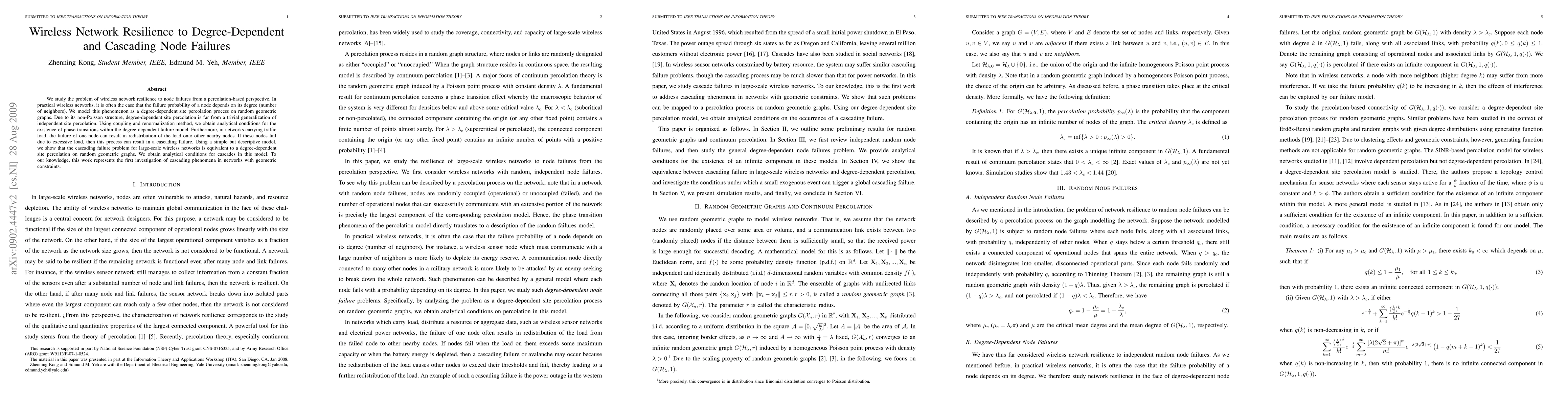 This paper investigates wireless network resilience through degree-dependent site percolation on random geometric graphs, modeling how node failure probability varies with degree. It also examines cascading failures due to load redistribution, showing their equivalence to degree-dependent percolation and deriving analytical conditions for both phase transitions and cascading failures.