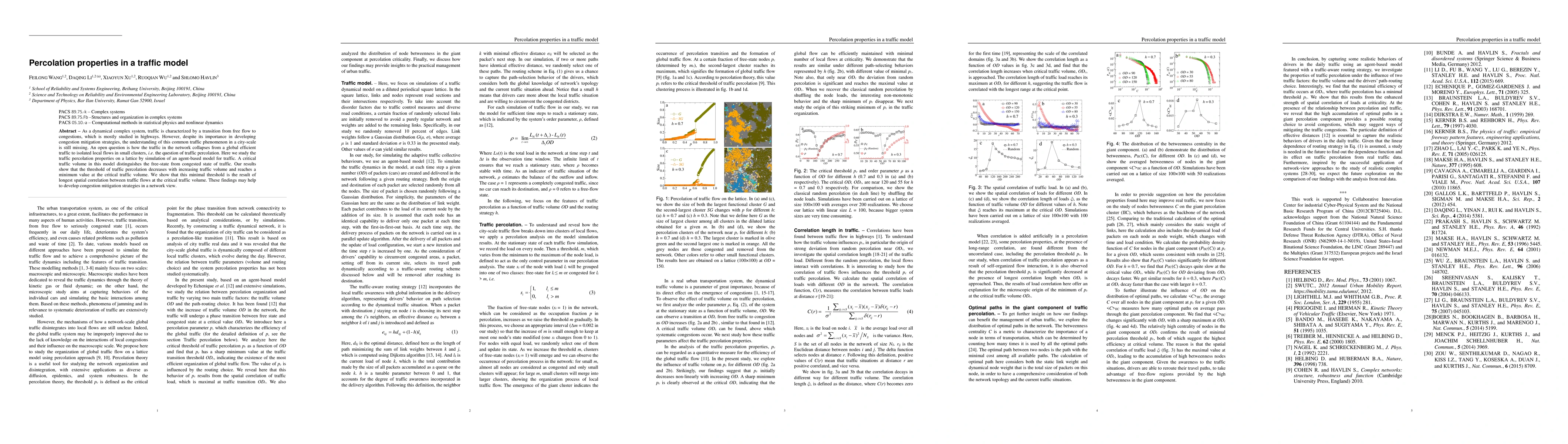 This paper investigates traffic percolation in an agent-based model on a lattice, finding a critical traffic volume that distinguishes free flow from congestion. The study reveals that the percolation threshold decreases with increasing traffic volume, reaching a minimum at the critical volume due to the longest spatial correlation of traffic flows.
