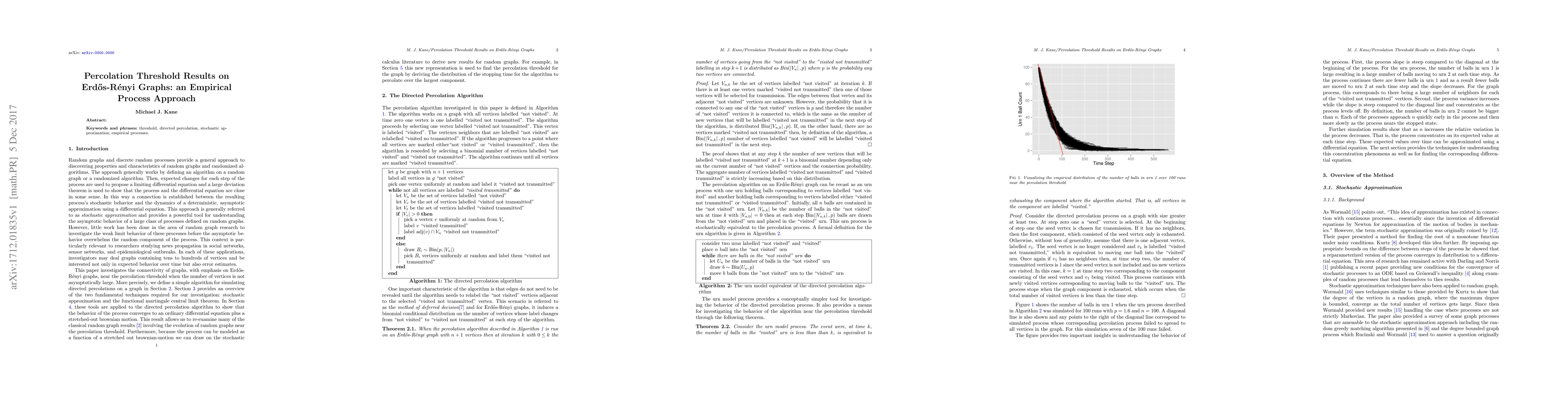 Summary: This paper explores directed percolation on Erdos-Renyi graphs, establishing weak limit results for the associated stochastic process and providing empirical insights into the percolation threshold.