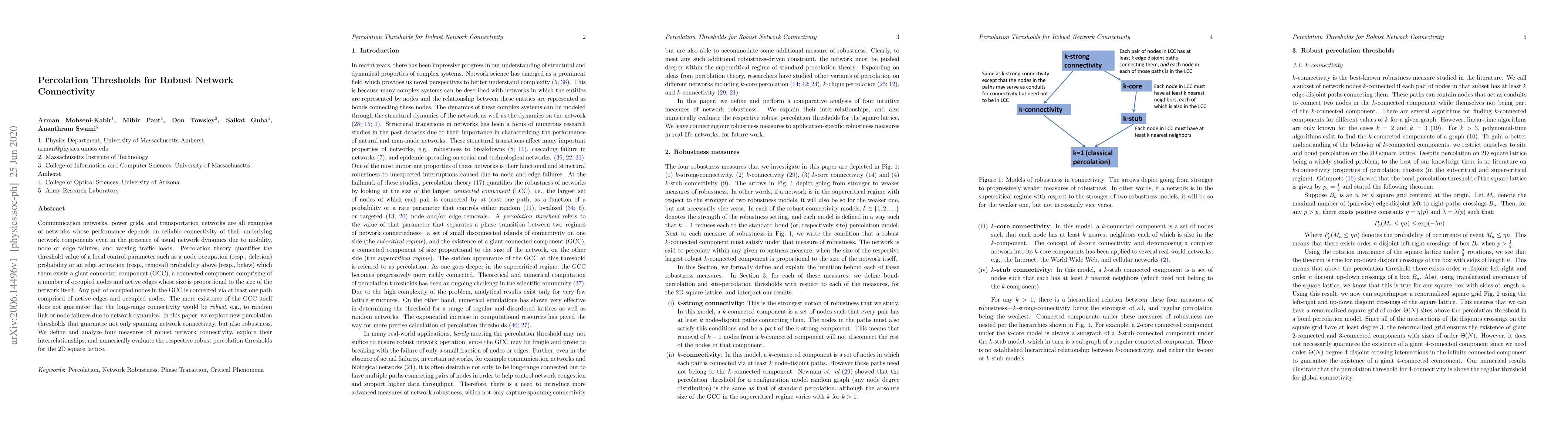 This paper explores new percolation thresholds that guarantee robust network connectivity in 2D square lattices, focusing on measures of long-range connectivity and robustness to random link or node failures.