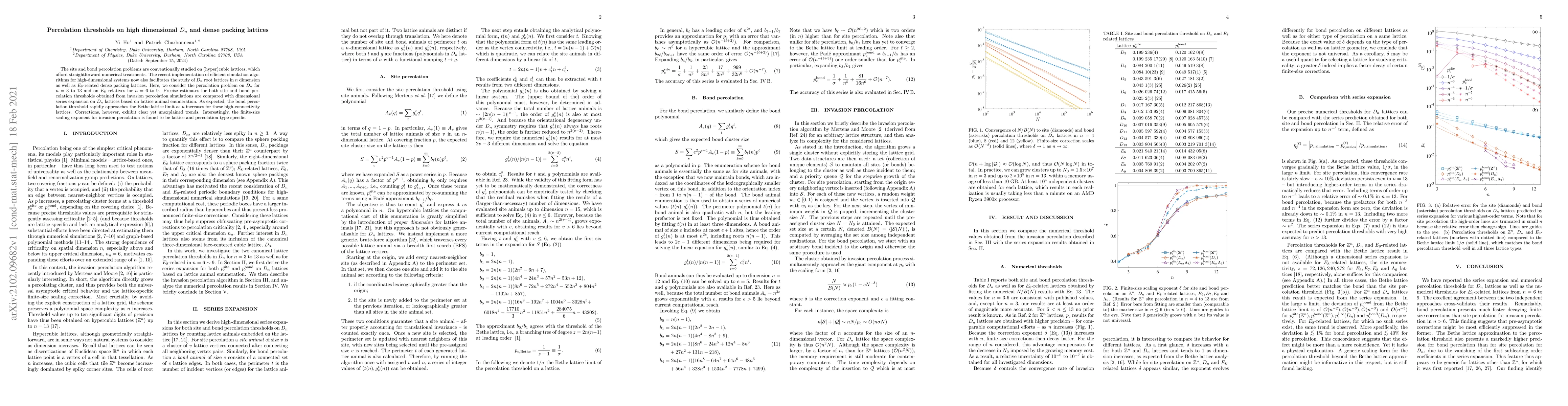 This paper investigates percolation thresholds on high-dimensional $D_n$ and $E_8$-related dense packing lattices, obtaining precise estimates via simulation and comparing them with theoretical models. The study finds that bond percolation thresholds approach the Bethe lattice limit as dimensionality increases, but unexplained trends in corrections and specific finite-size scaling exponents are observed.
