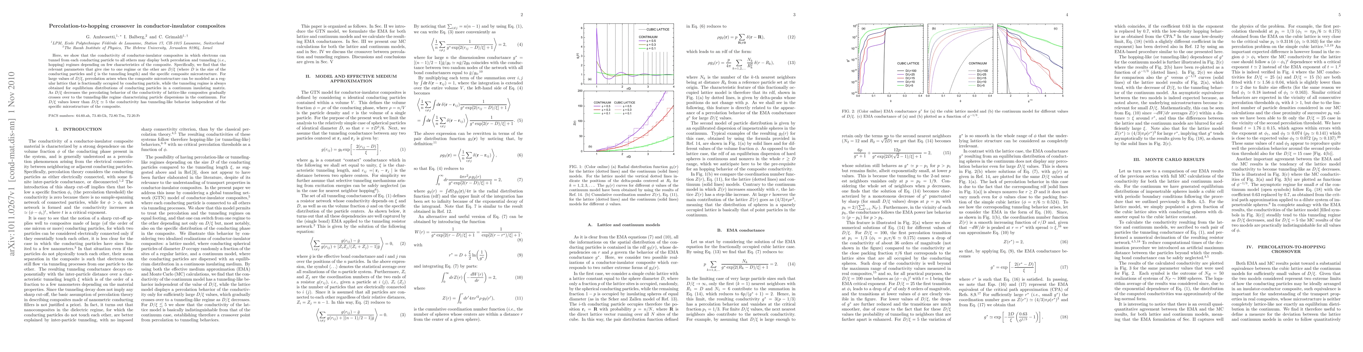 This paper investigates the conductivity behavior of conductor-insulator composites, demonstrating a transition from percolation to tunneling regimes based on the ratio $D/\xi$ and composite microstructure. The percolation regime dominates for large $D/\xi$ and regular lattice composites, while tunneling dominates for small $D/\xi$ and dispersed particle distributions.