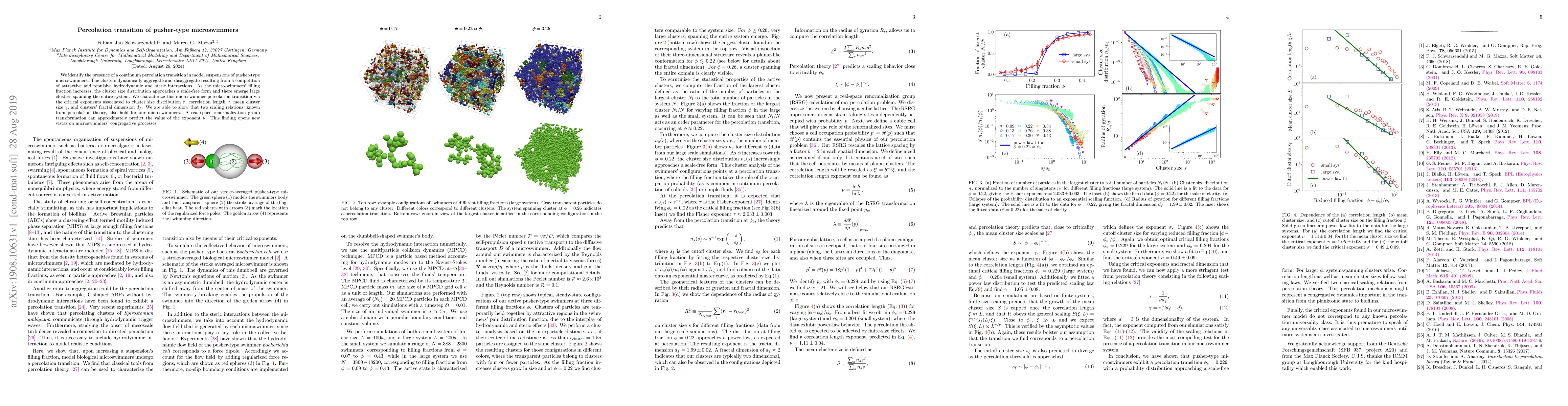 We identify the presence of a continuum percolation transition in model suspensions of pusher-type microswimmers. The clusters dynamically aggregate and disaggregate resulting from a competition of attractive and repulsive hydrodynamic and steric interactions. As the microswimmers' filling fraction increases, the cluster size distribution approaches a scale-free form and there emerge large clusters spanning the entire system. We characterize this microswimmer percolation transition via the critical exponents associated to cluster size distribution $\tau$, correlation length $\nu$, mean cluster size $\gamma$, and clusters' fractal dimension $d_f$. We are able to show that two scaling relations, known from percolation theory, also hold for our microswimmers. A real-space renormalization group transformation can approximately predict the value of the exponent $\nu$. This finding opens new vistas on microswimmers' congregative processes.