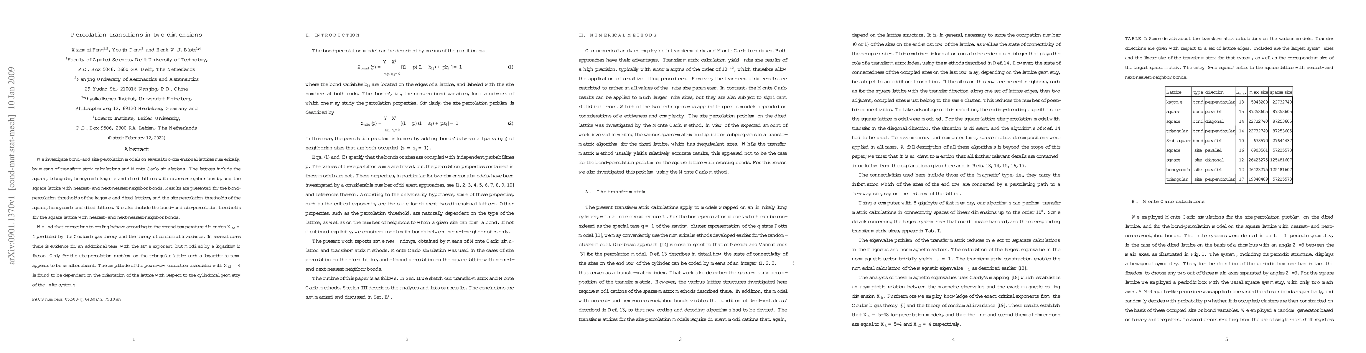 This paper numerically examines bond- and site-percolation models on various two-dimensional lattices, reporting thresholds and scaling behaviors, with notable findings supporting the Coulomb gas theory and conformal invariance. It highlights the orientation-dependent amplitude of power-law corrections and the presence or absence of logarithmic modifications in different percolation scenarios.