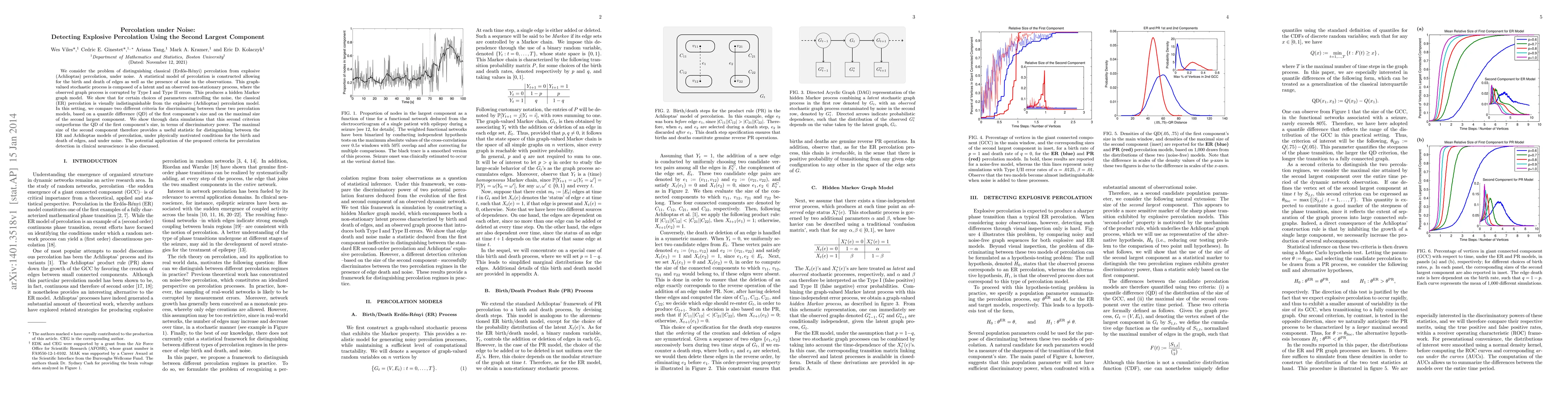 We consider the problem of distinguishing classical (Erd\H{o}s-R\'{e}nyi) percolation from explosive (Achlioptas) percolation, under noise. A statistical model of percolation is constructed allowing for the birth and death of edges as well as the presence of noise in the observations. This graph-valued stochastic process is composed of a latent and an observed non-stationary process, where the observed graph process is corrupted by Type I and Type II errors. This produces a hidden Markov graph model. We show that for certain choices of parameters controlling the noise, the classical (ER) percolation is visually indistinguishable from the explosive (Achlioptas) percolation model. In this setting, we compare two different criteria for discriminating between these two percolation models, based on a quantile difference (QD) of the first component's size and on the maximal size of the second largest component. We show through data simulations that this second criterion outperforms the QD of the first component's size, in terms of discriminatory power. The maximal size of the second component therefore provides a useful statistic for distinguishing between the ER and Achlioptas models of percolation, under physically motivated conditions for the birth and death of edges, and under noise. The potential application of the proposed criteria for percolation detection in clinical neuroscience is also discussed.