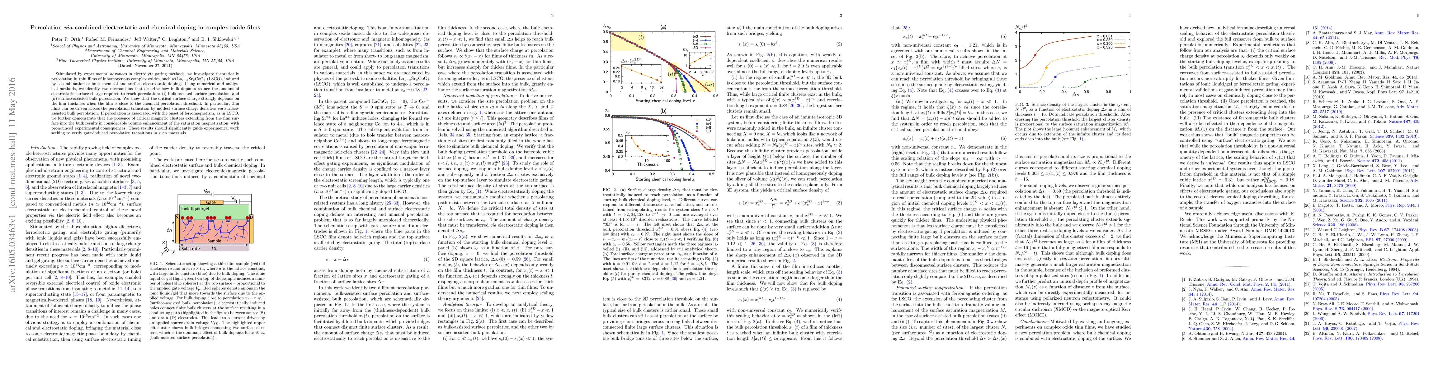 This paper theoretically explores percolation in complex oxide films like La$_{1-x}$Sr$_{x}$CoO$_{3}$ via combined electrostatic and chemical doping, identifying two mechanisms that reduce the required surface charge for percolation. The study highlights significant volume enhancement of saturation magnetization near the chemical percolation threshold, with implications for experimental verification of gate-induced transitions in such materials.