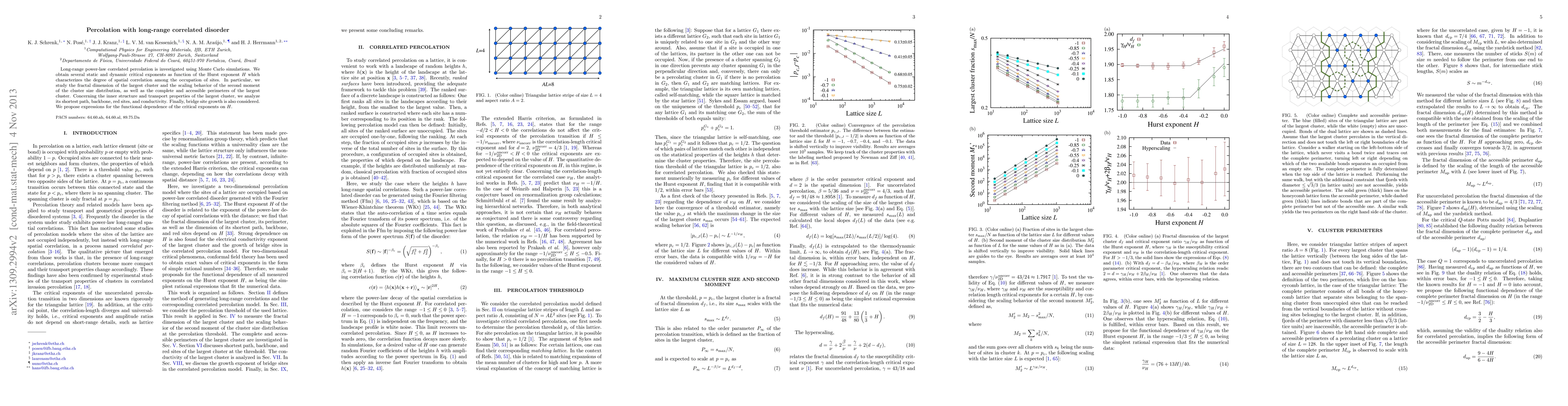 This paper investigates percolation with long-range correlated disorder using Monte Carlo simulations, focusing on critical exponents as functions of the Hurst exponent $H$. It examines the fractal dimension, scaling behavior, and transport properties of the largest cluster, proposing expressions for the functional dependence of critical exponents on $H$.