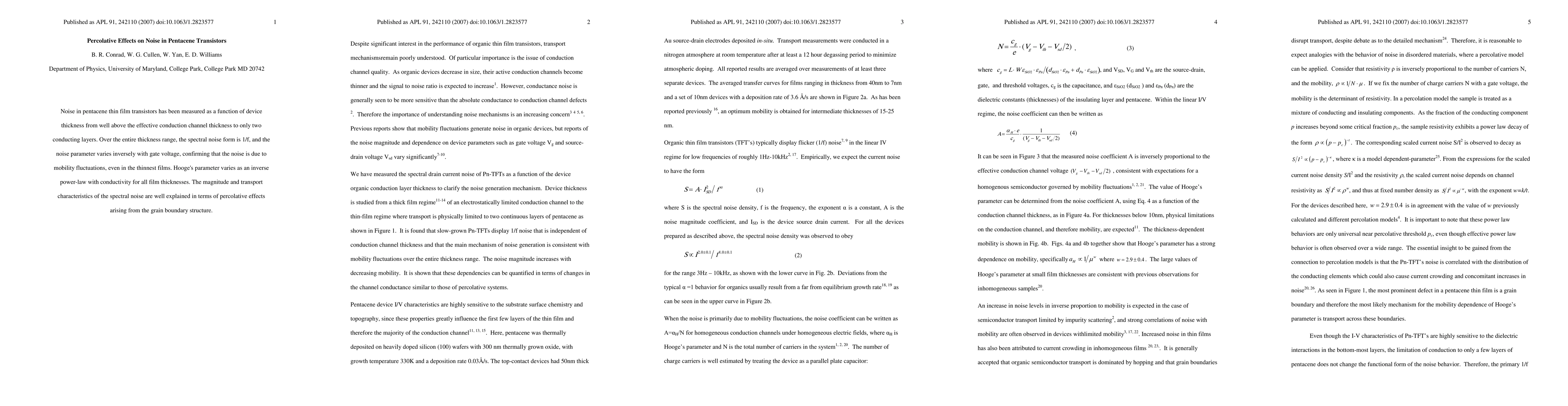 The 1/f noise in pentacene thin film transistors has been measured as a function of device thickness from well above the effective conduction channel thickness to only two conducting layers. Over the entire thickness range, the spectral noise form is 1/f, and the noise parameter varies as (gate voltage)-1, confirming that the noise is due to mobility fluctuations, even in the thinnest films. Hooge's parameter varies as an inverse power-law with conductivity for all film thicknesses. The magnitude and transport characteristics of the spectral noise are well explained in terms of percolative effects arising from the grain boundary structure.