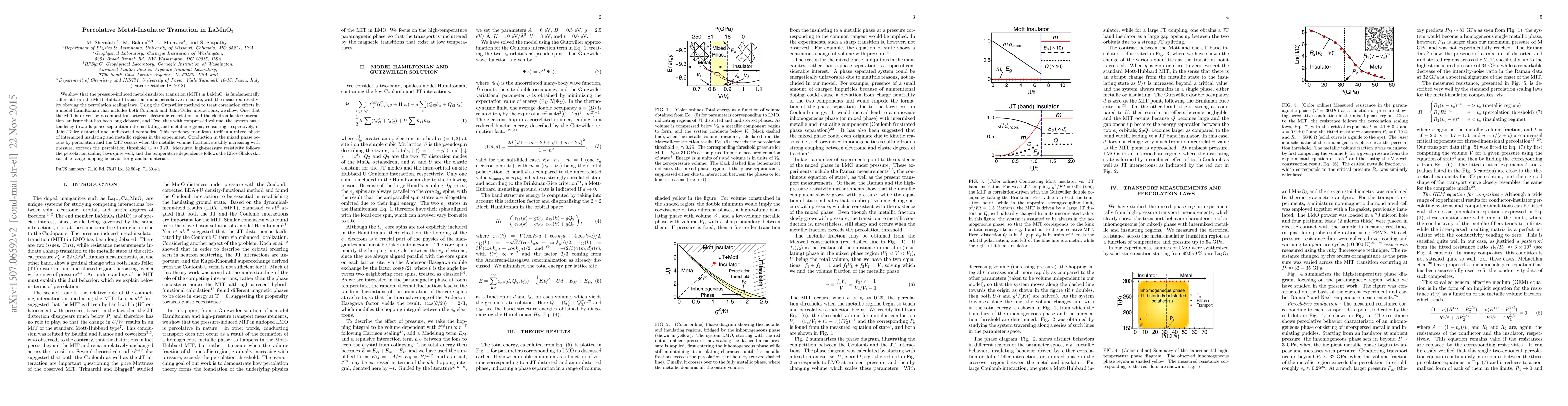 The pressure-induced metal-insulator transition in LaMnO$_3$ is percolative rather than a Mott-Hubbard transition, driven by competition between electronic correlation and electron-lattice interaction, leading to phase separation and percolation conduction. High-pressure resistivity obeys percolation scaling laws, confirming the percolative nature of the transition.