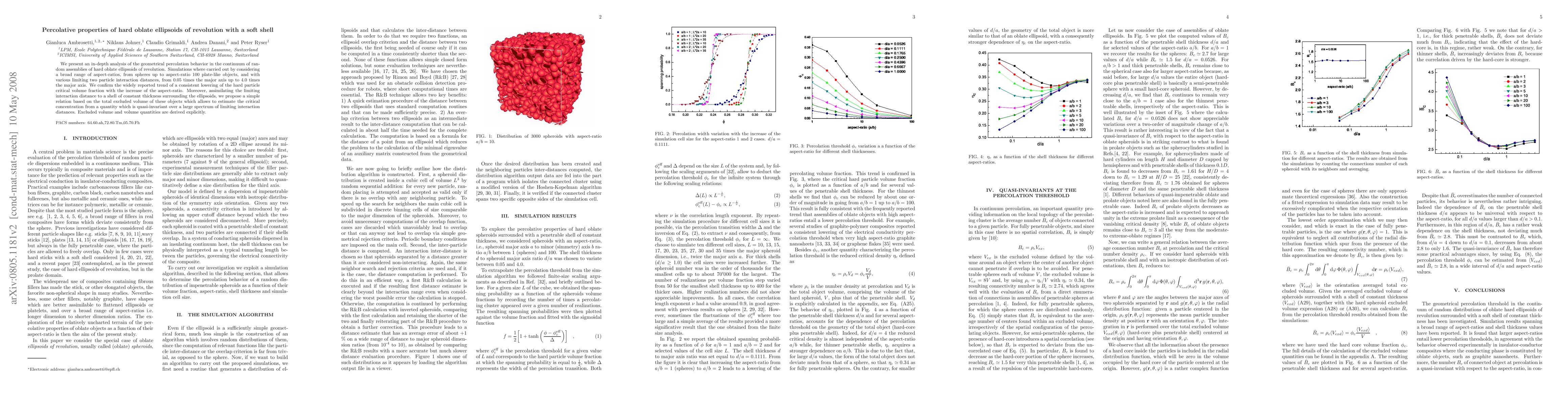 We present an in-depth analysis of the geometrical percolation behavior in the continuum of random assemblies of hard oblate ellipsoids of revolution. Simulations where carried out by considering a broad range of aspect-ratios, from spheres up to aspect-ratio 100 plate-like objects, and with various limiting two particle interaction distances, from 0.05 times the major axis up to 4.0 times the major axis. We confirm the widely reported trend of a consistent lowering of the hard particle critical volume fraction with the increase of the aspect-ratio. Moreover, assimilating the limiting interaction distance to a shell of constant thickness surrounding the ellipsoids, we propose a simple relation based on the total excluded volume of these objects which allows to estimate the critical concentration from a quantity which is quasi-invariant over a large spectrum of limiting interaction distances. Excluded volume and volume quantities are derived explicitly.