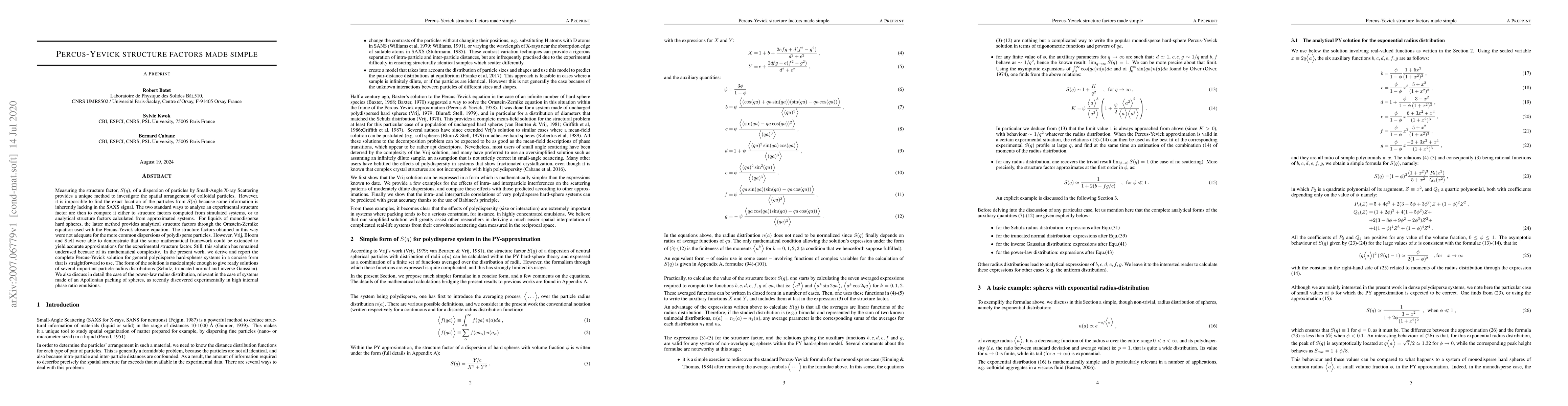 Measuring the structure factor, S(q), of a dispersion of particles by Small-Angle X-ray Scattering provides a unique method to investigate the spatial arrangement of colloidal particles. However, it is impossible to find the exact location of the particles from S(q) because some information is inherently lacking in the SAXS signal. The two standard ways to analyse an experimental structure factor are then to compare it either to structure factors computed from simulated systems, or to analytical structure factors calculated from approximated systems. For liquids of monodisperse hard spheres, the latter method provides analytical structure factors through the Ornstein-Zernike equation used with the Percus-Yevick closure equation. The structure factors obtained in this way were not adequate for the more common dispersions of polydisperse particles. However, Vrij, Bloom and Stell were able to demonstrate that the same mathematical framework could be extended to yield accurate approximations for the experimental structure factor. Still, this solution has remained underused because of its mathematical complexity. In the present work, we derive and report the complete Percus-Yevick solution for general polydisperse hard-spheres systems in a concise form that is straightforward to use. The form of the solution is made simple enough to give ready solutions of several important particle-radius distributions (Schulz, truncated normal and inverse Gaussian). We also discuss in detail the case of the power-law radius distribution, relevant in the case of systems made of an Apollonian packing of spheres, as recently discovered experimentally in high internal-phase-ratio emulsions.