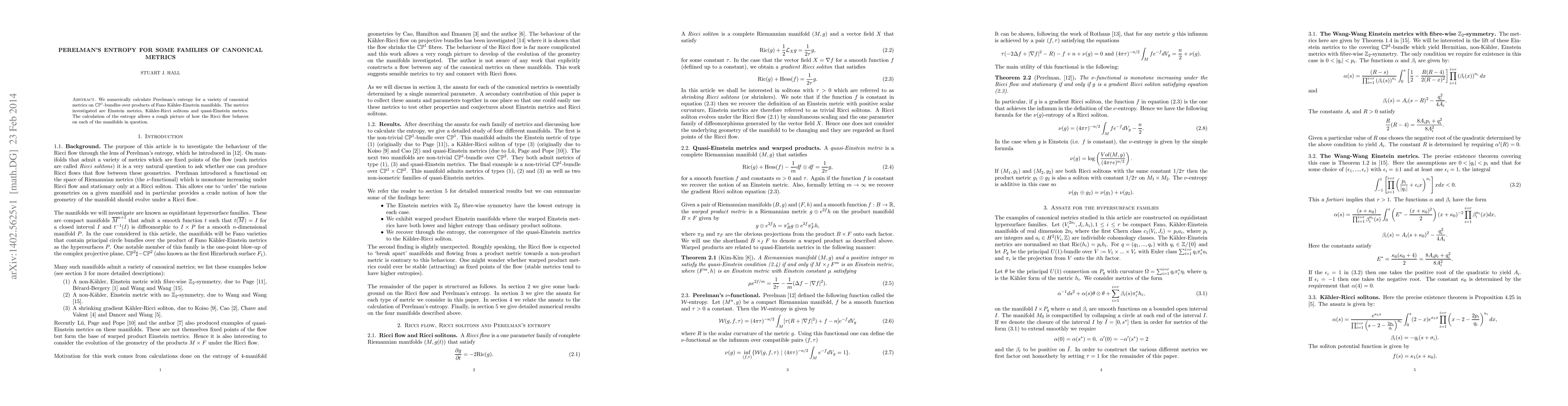 We numerically calculate Perelman's entropy for a variety of canonical metrics on $\mathbb{CP}^{1}$-bundles over products of Fano K\"ahler-Einstein manifolds. The metrics investigated are Einstein metrics, K\"ahler-Ricci solitons and quasi-Einstein metrics. The calculation of the entropy allows a rough picture of how the Ricci flow behaves on each of the manifolds in question.