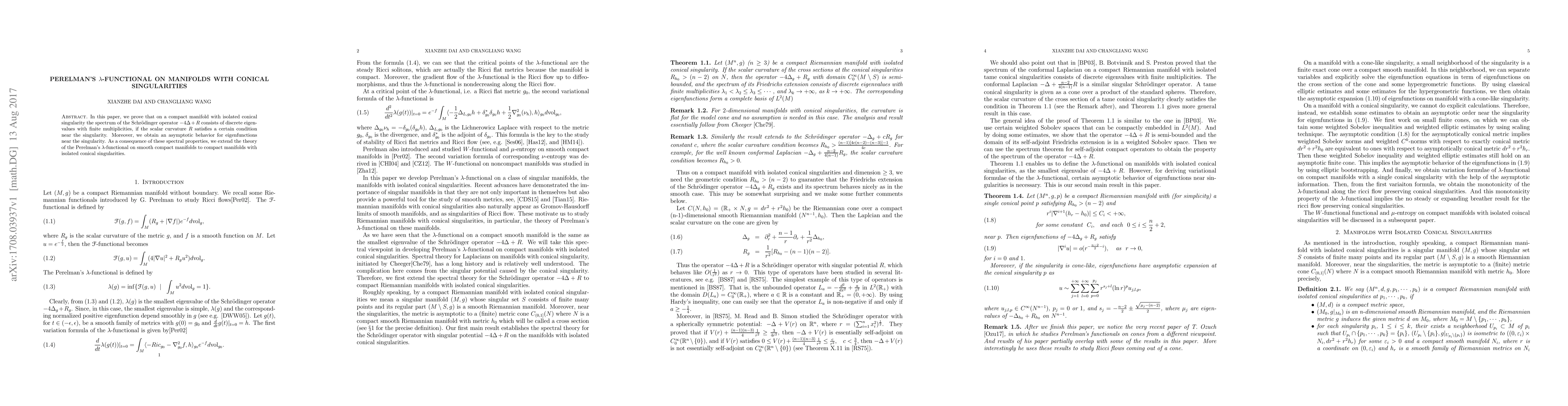 In this paper, we prove that on a compact manifold with isolated conical singularity the spectrum of the Schr\"odinger operator $-4\Delta+R$ consists of discrete eigenvalues with finite multiplicities, if the scalar curvature $R$ satisfies a certain condition near the singularity. Moreover, we obtain an asymptotic behavior for eigenfunctions near the singularity. As a consequence of these spectral properties, we extend the theory of the Perelman's $\lambda$-functional on smooth compact manifolds to compact manifolds with isolated conical singularities.