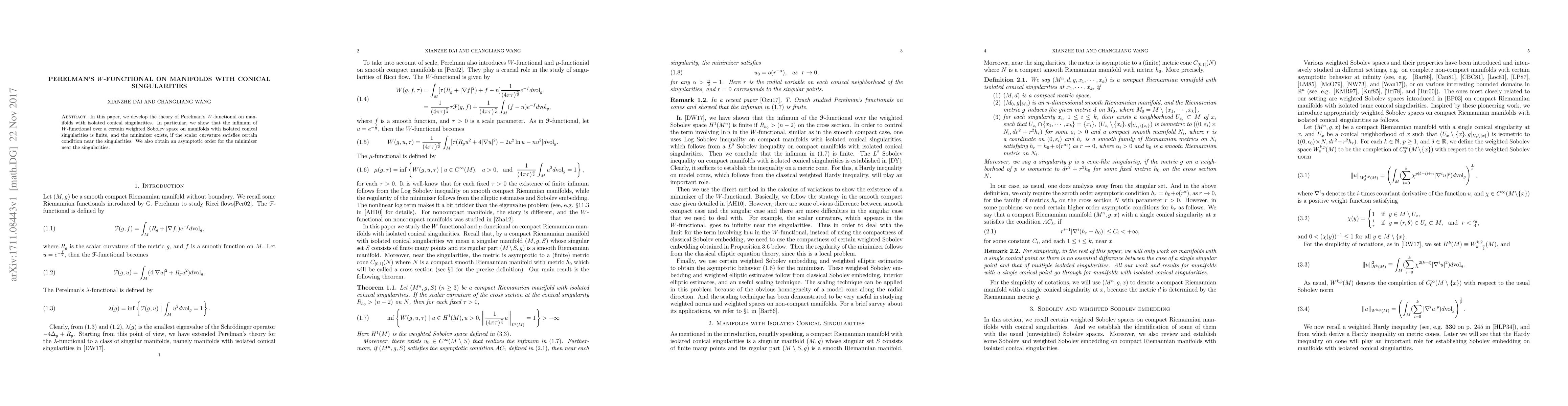This paper extends Perelman's $W$-functional theory to manifolds with conical singularities, proving the finiteness of its infimum and existence of a minimizer under specific scalar curvature conditions, along with determining its asymptotic behavior near singularities.