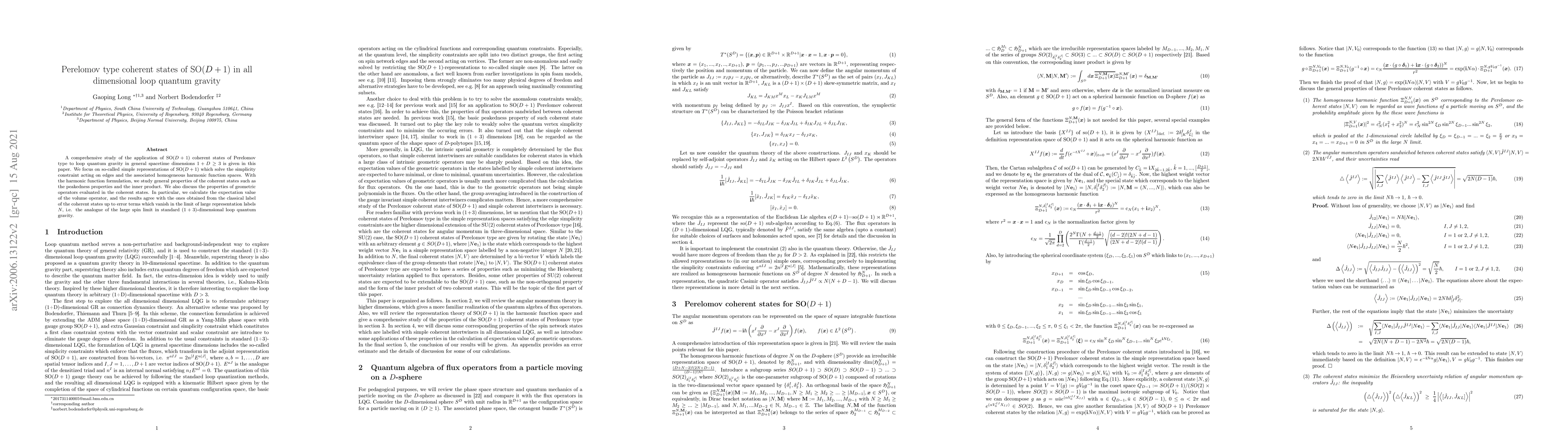A comprehensive study of the application of SO$(D+1)$ coherent states of Perelomov type to loop quantum gravity in general spacetime dimensions $D+1\geq 3$ is given in this paper. We focus on so-called simple representations of SO$(D+1)$ which solve the simplicity constraint and the associated homogeneous harmonic function spaces. With the harmonic function formulation, we study general properties of the coherent states such as the peakedness properties and the inner product. We also discuss the properties of geometric operators evaluated in the coherent states. In particular, we calculate the expectation value of the volume operator, and the results agree with the ones obtained from the classical label of the coherent states up to error terms which vanish in the limit of large representation labels $N$, i.e. the analogue of the large spin limit in standard $3+1$-dimensional loop quantum gravity.