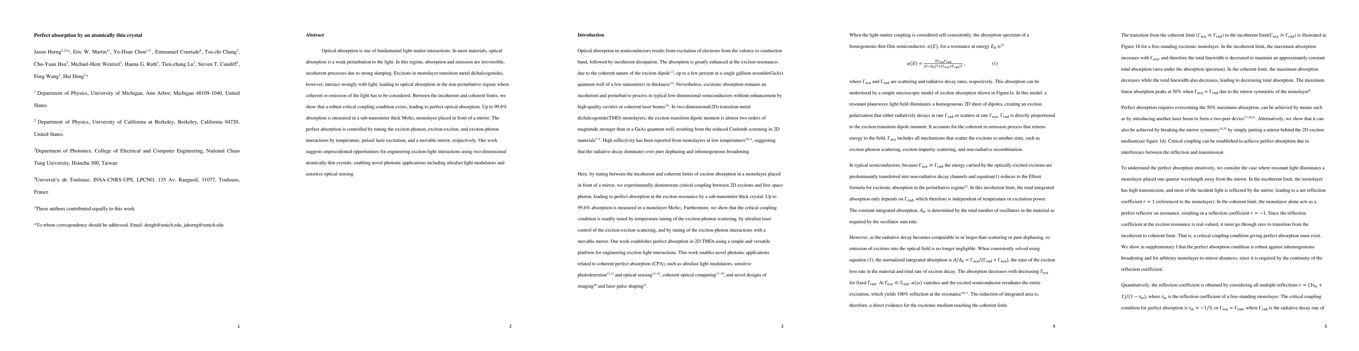 Optical absorption is one of fundamental light-matter interactions. In most materials, optical absorption is a weak perturbation to the light. In this regime, absorption and emission are irreversible, incoherent processes due to strong damping. Excitons in monolayer transition metal dichalcogenides, however, interact strongly with light, leading to optical absorption in the non-perturbative regime where coherent re-emission of the light has to be considered. Between the incoherent and coherent limits, we show that a robust critical coupling condition exists, leading to perfect optical absorption. Up to 99.6% absorption is measured in a sub-nanometer thick MoSe2 monolayer placed in front of a mirror. The perfect absorption is controlled by tuning the exciton-phonon, exciton-exciton, and exciton-photon interactions by temperature, pulsed laser excitation, and a movable mirror, respectively. Our work suggests unprecedented opportunities for engineering exciton-light interactions using two-dimensional atomically thin crystals, enabling novel photonic applications including ultrafast light modulators and sensitive optical sensing.