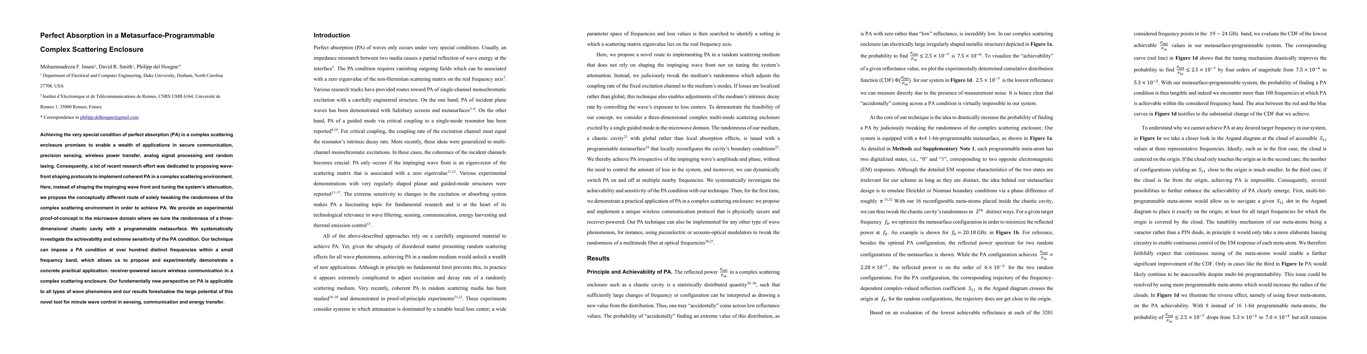 This paper proposes a novel method to achieve perfect absorption in a complex scattering environment by adjusting the randomness of the scattering environment using a programmable metasurface. The technique demonstrates perfect absorption at over a hundred frequencies within a small band, enabling secure wireless communication applications.