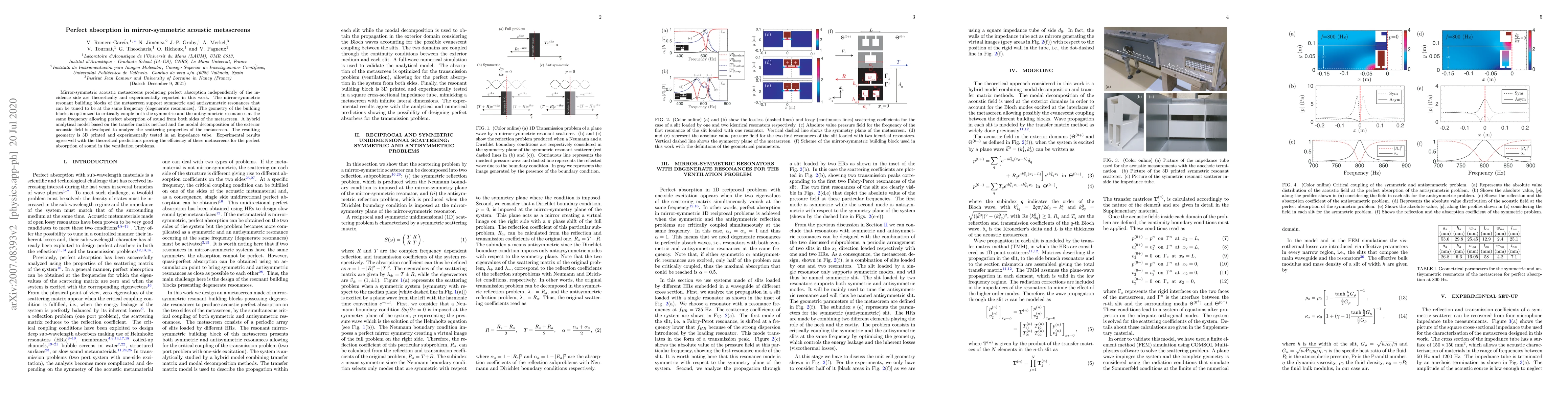 Mirror-symmetric acoustic metascreens producing perfect absorption independently of the incidence side are theoretically and experimentally reported in this work. The mirror-symmetric resonant building blocks of the metascreen support symmetric and antisymmetric resonances that can be tuned to be at the same frequency (degenerate resonances). The geometry of the building blocks is optimized to critically couple both the symmetric and the antisymmetric resonances at the same frequency allowing perfect absorption of sound from both sides of the metascreen. A hybrid analytical model based on the transfer matrix method and the modal decomposition of the exterior acoustic field is developed to analyze the scattering properties of the metascreen. The resulting geometry is 3D printed and experimentally tested in an impedance tube. Experimental results agree well with the theoretical predictions proving the efficiency of these metascreens for the perfect absorption of sound in the ventilation problems.