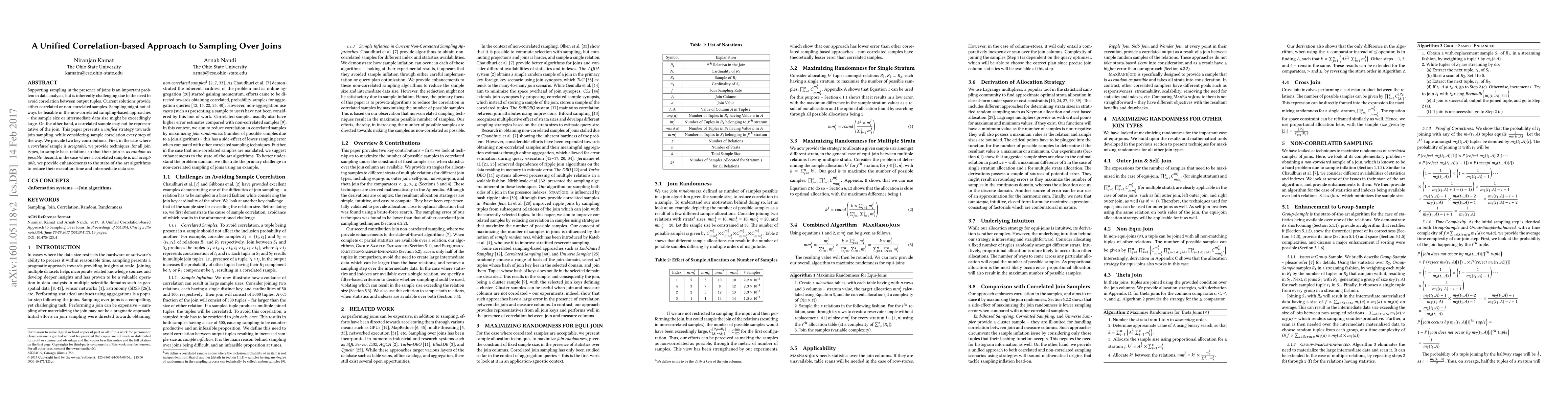 This paper presents a unified strategy for stratified sampling over joins, addressing the challenge of avoiding correlated output tuples. It provides methods to maximize randomness in correlated samples for various join types and enhances non-correlated sampling techniques to improve efficiency and reduce intermediate data size.