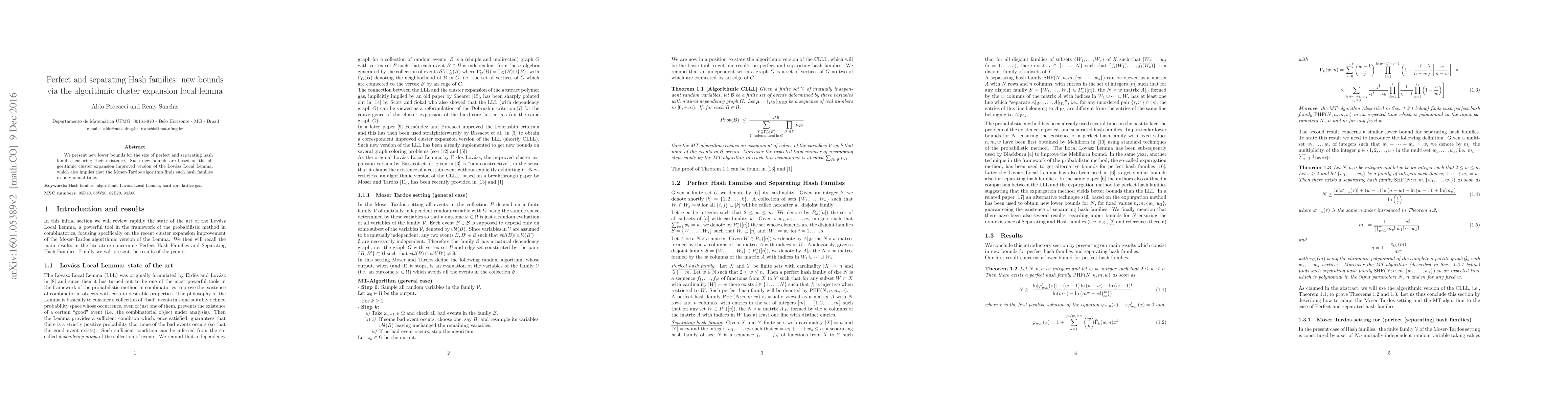 New research sets lower bounds for perfect and separating hash families, ensuring their existence in polynomial time via the algorithmic cluster expansion improved version of the Lovsz Local Lemma.