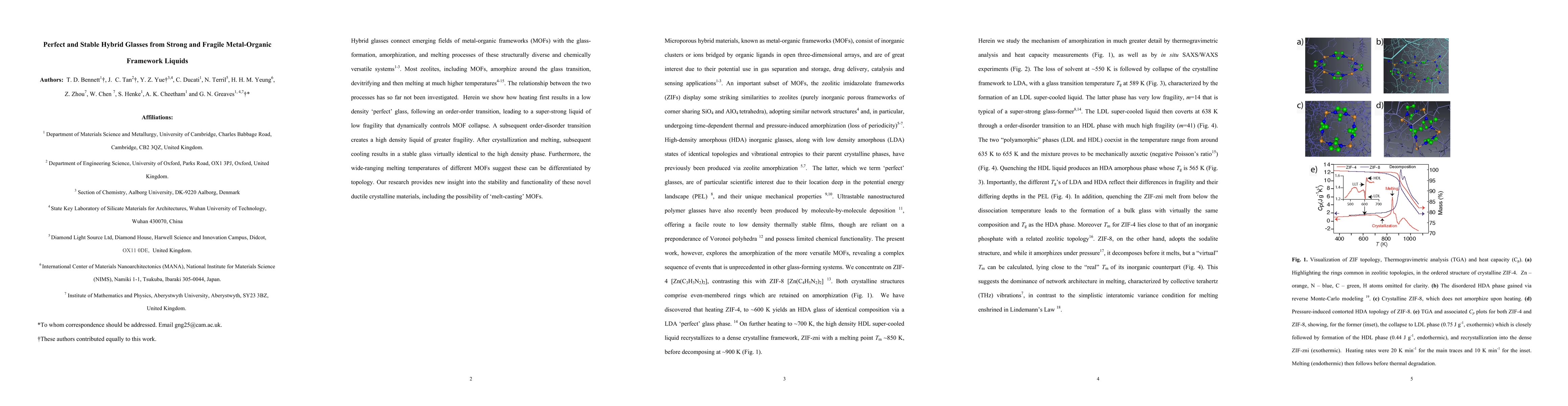 Hybrid glasses connect emerging fields of metal-organic frameworks (MOFs) with the glass-formation, amorphization, and melting processes of these structurally diverse and chemically versatile systems. Most zeolites, including MOFs, amorphize around the glass transition, devitrifying and then melting at much higher temperatures. The relationship between the two processes has so far not been investigated. Herein we show how heating first results in a low density perfect glass, following an order-order transition, leading to a super-strong liquid of low fragility that dynamically controls MOF collapse. A subsequent order-disorder transition creates a high density liquid of greater fragility. After crystallization and melting, subsequent cooling results in a stable glass virtually identical to the high density phase. Furthermore, the wide-ranging melting temperatures of different MOFs suggest these can be differentiated by topology. Our research provides new insight into the stability and functionality of these novel ductile crystalline materials, including the possibility of melt-casting MOFs.