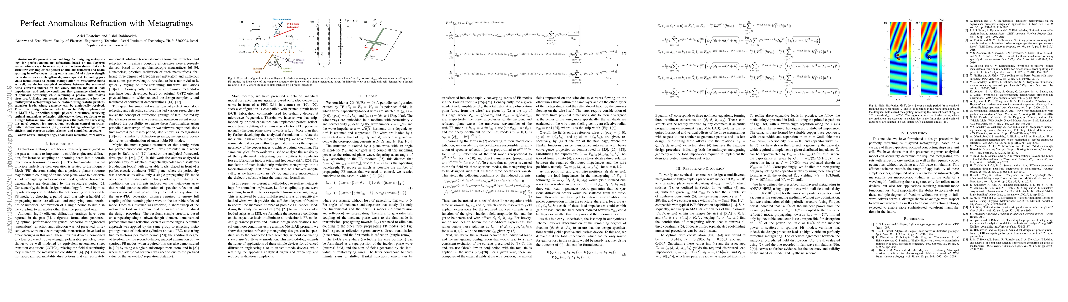 The paper presents a methodology for designing metagratings for perfect anomalous refraction using multilayered loaded wire arrays. It extends previous formulations to manipulate transmitted fields, ensuring elimination of spurious scattering while maintaining a passive and lossless structure. The design scheme is fully implementable in MATLAB, prescribing simple physical structures for optimal anomalous refraction efficiency without requiring full-wave simulations.