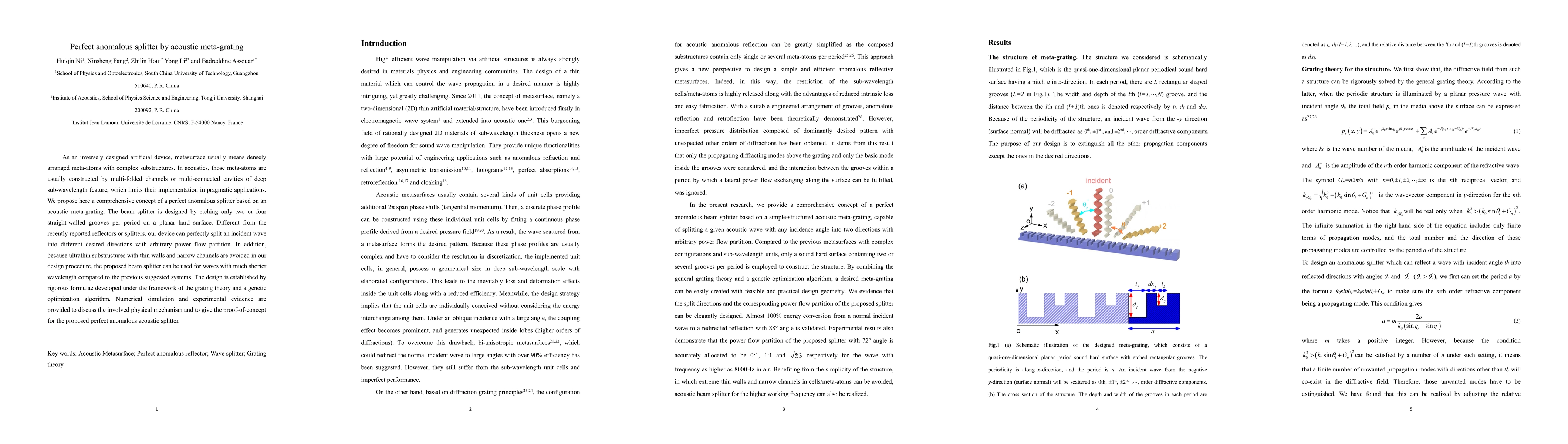 The development of a numerical approach for designing meta-gratings with simplified structures (two or four grooves per period) that can split sound waves into desired directions with arbitrary power flow partition.