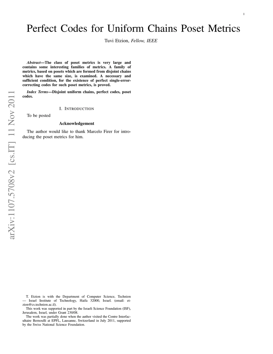 This paper investigates poset metrics derived from uniform chains and establishes a necessary and sufficient condition for the existence of perfect single-error-correcting codes within these metrics. The findings provide a comprehensive understanding of error-correcting codes in this specific class of poset metrics.