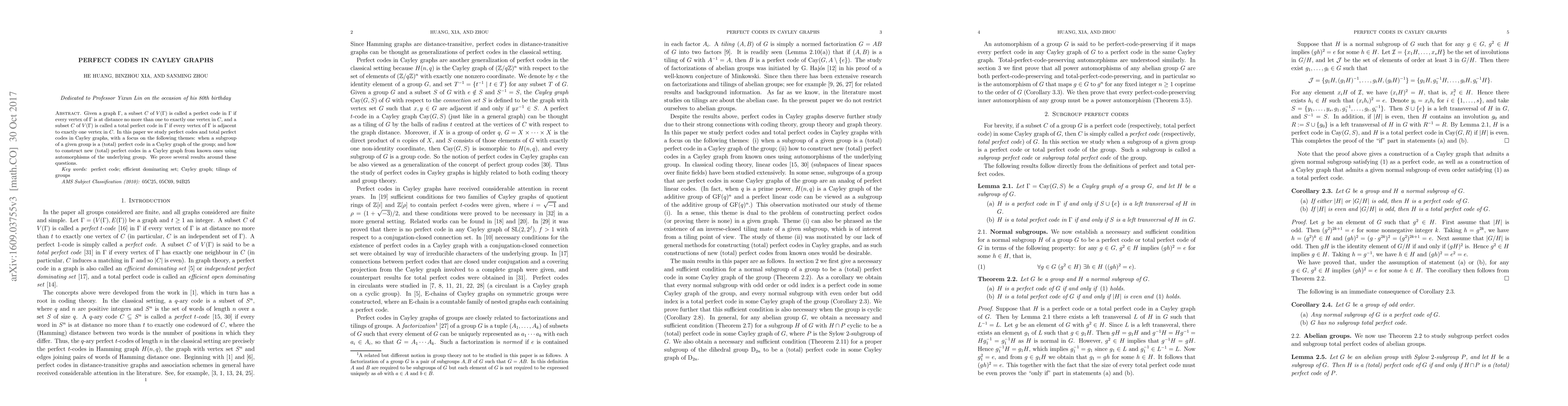 This paper investigates perfect and total perfect codes in Cayley graphs, focusing on conditions under which subgroups form such codes and methods to generate new codes from known ones via group automorphisms, providing several theoretical results.