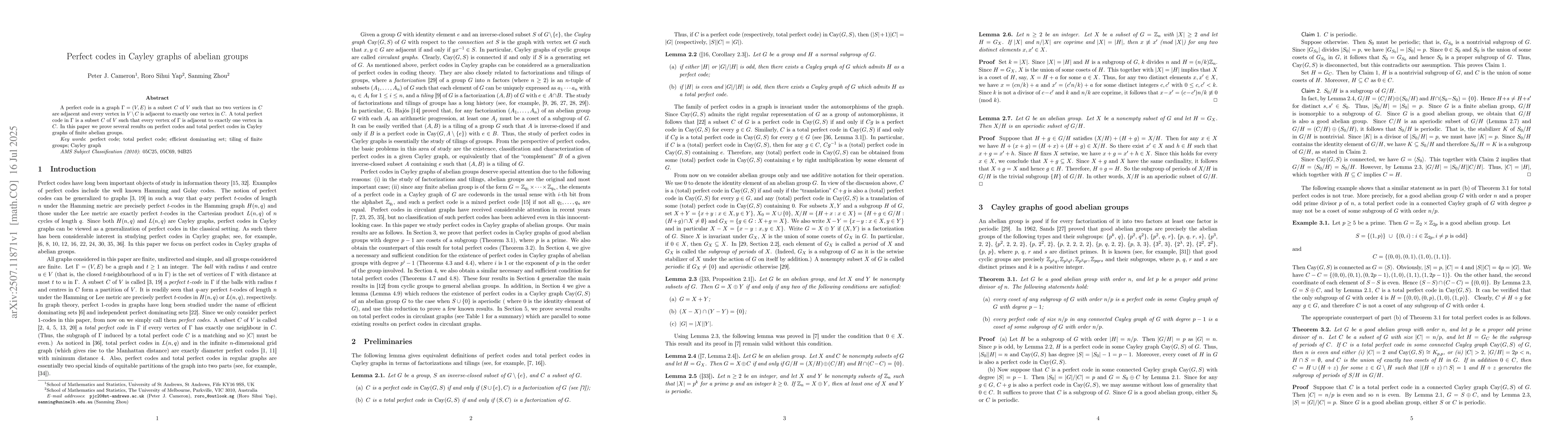 The paper introduces and proves several lemmas and theorems concerning perfect codes and total perfect codes in Cayley graphs of abelian groups, extending previous work in the field.