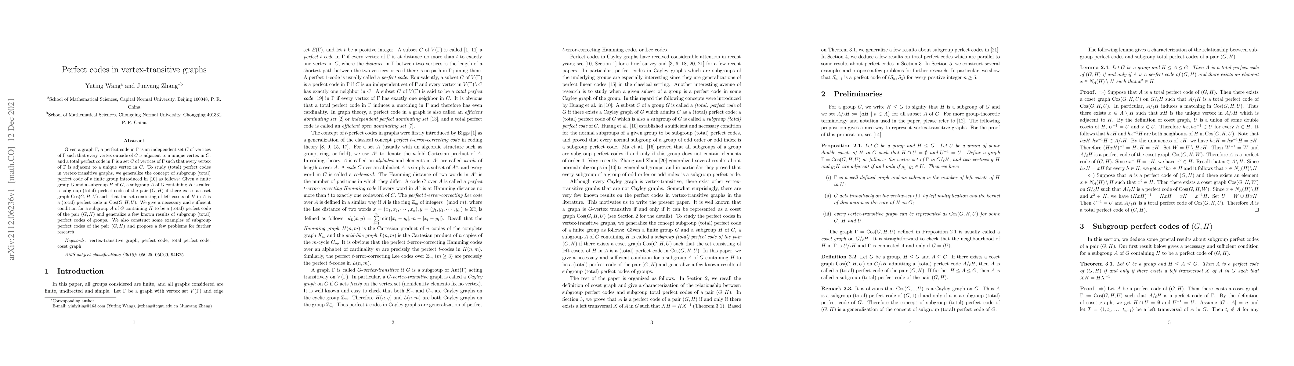 This paper studies perfect codes in vertex-transitive graphs by generalizing the concept of subgroup perfect codes from groups. It provides necessary and sufficient conditions for a subgroup to be a perfect code and proposes several problems for future research, along with constructing relevant examples.