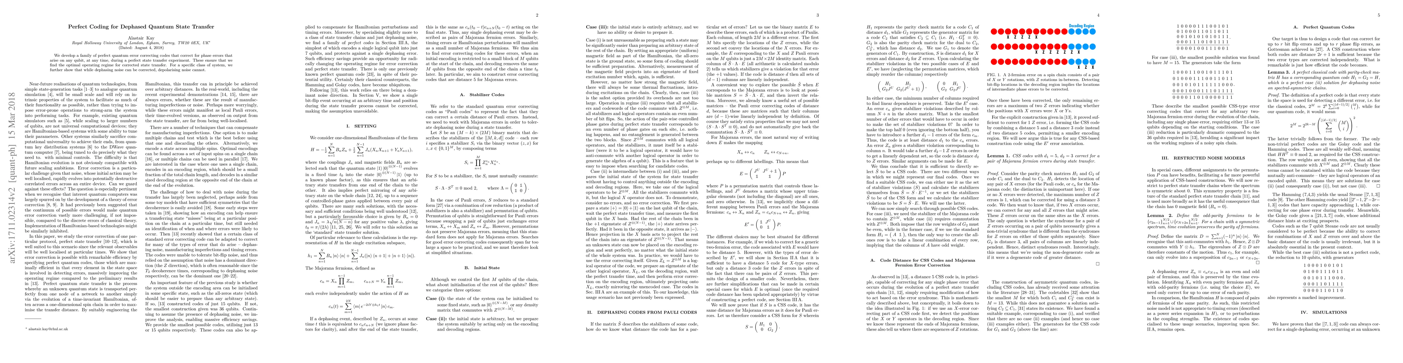 This paper introduces perfect quantum error correcting codes that correct phase errors during state transfer, ensuring optimal operation. It also demonstrates that while dephasing noise can be corrected, depolarizing noise remains uncorrectable for a specific system class.