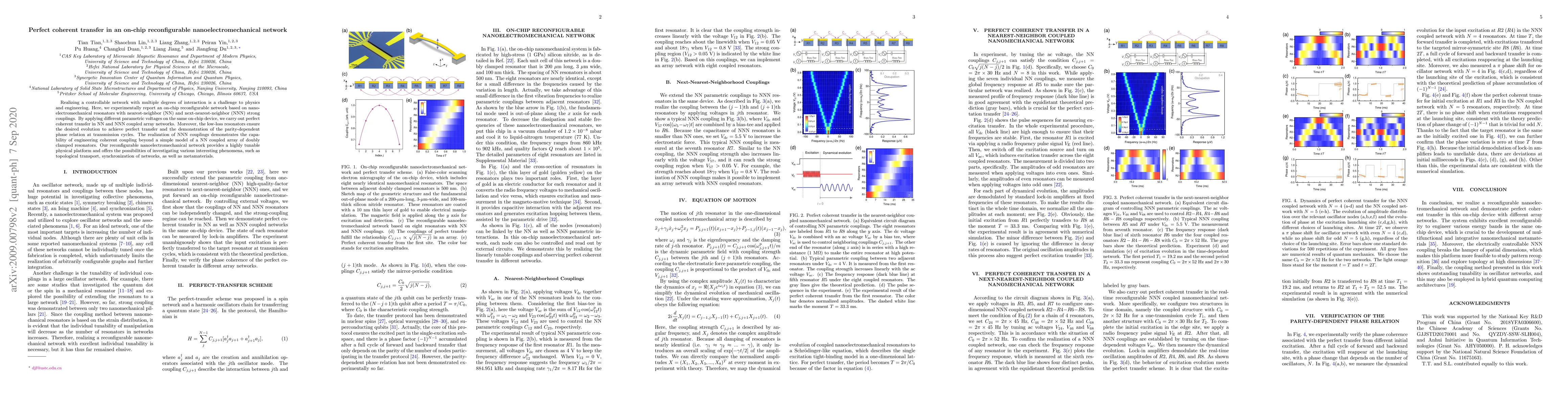 This paper reports the experimental realization of an on-chip reconfigurable nanoelectromechanical network with strong nearest-neighbor and next-nearest-neighbor couplings, achieving perfect coherent transfer through tunable parametric voltages. The study highlights the potential for exploring phenomena like topological transport and network synchronization.
