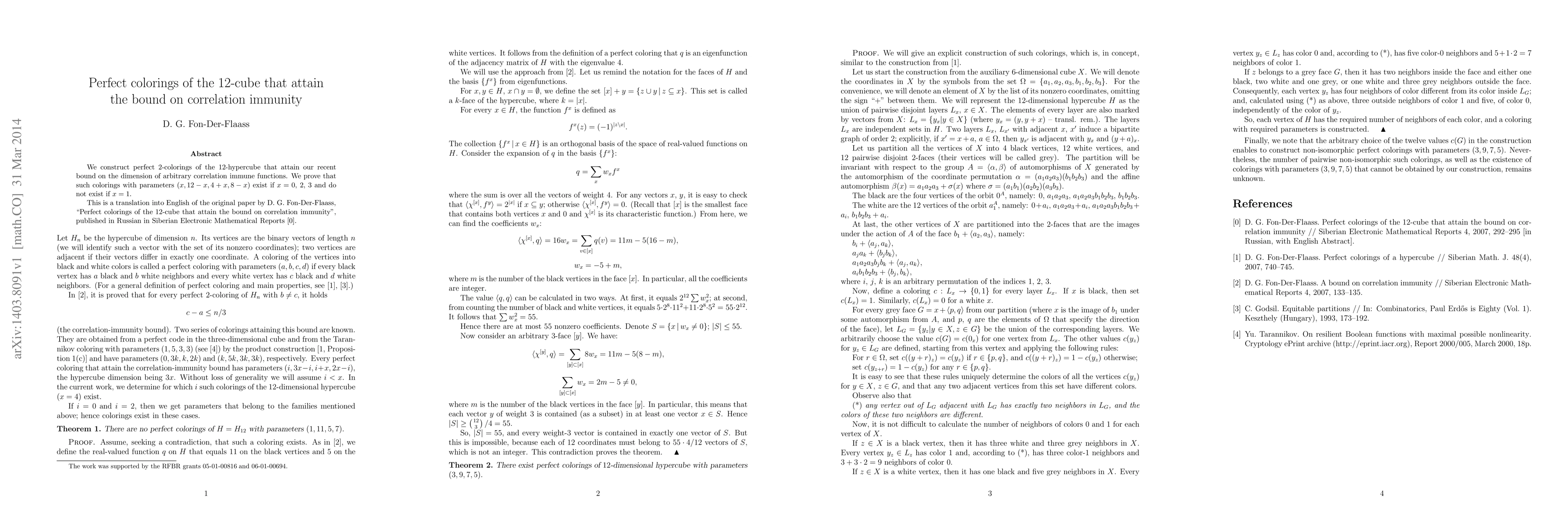 Researchers found perfect 2-colorings of the 12-cube that meet a specific bound on correlation immunity, with existing colorings for certain values of x and no colorings for others.