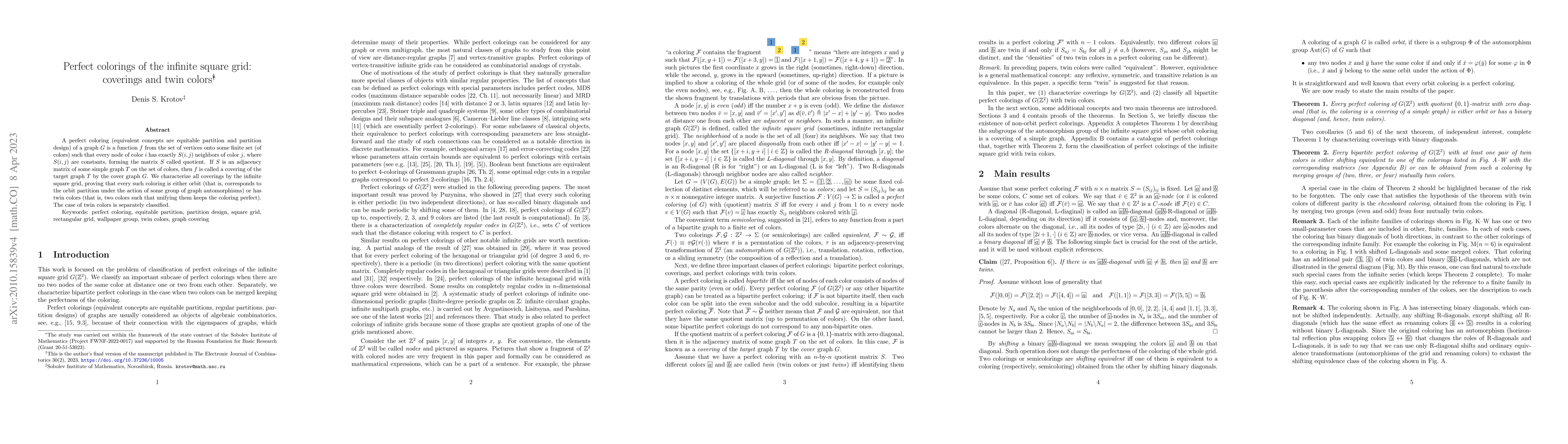 This paper characterizes perfect colorings of the infinite square grid, showing that they either correspond to orbit partitions under graph automorphisms or involve "twin colors," where merging two colors maintains the coloring's perfection. The study also classifies the case of twin colors separately.