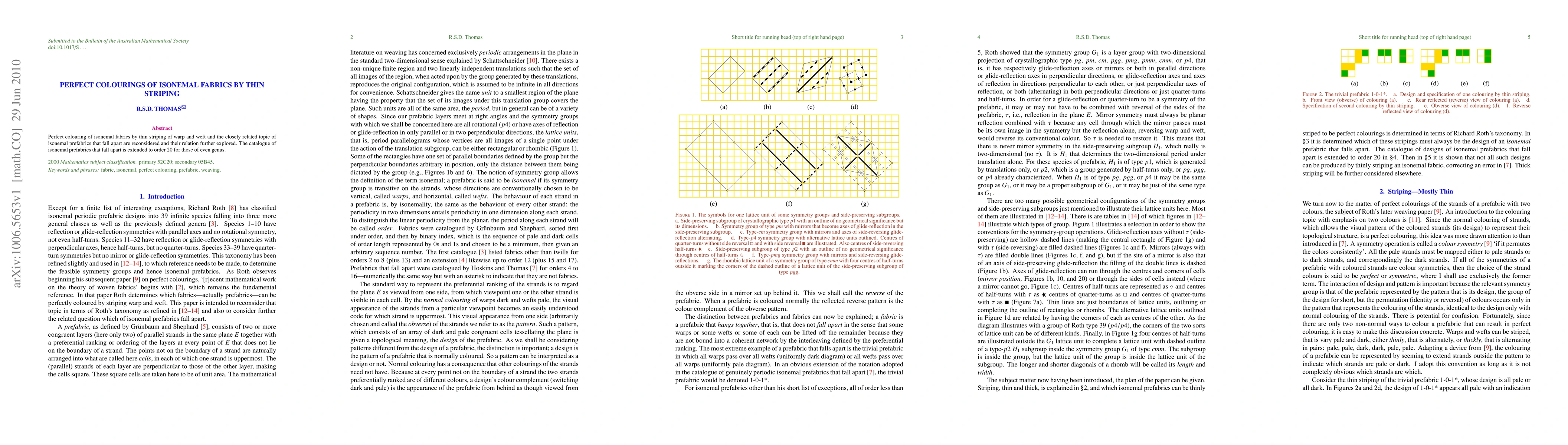 Perfect colouring of isonemal fabrics by thin striping of warp and weft and the closely related topic of isonemal prefabrics that fall apart are reconsidered and their relation further explored. The catalogue of isonemal prefabrics that fall apart is extended to order 20 for those of even genus.